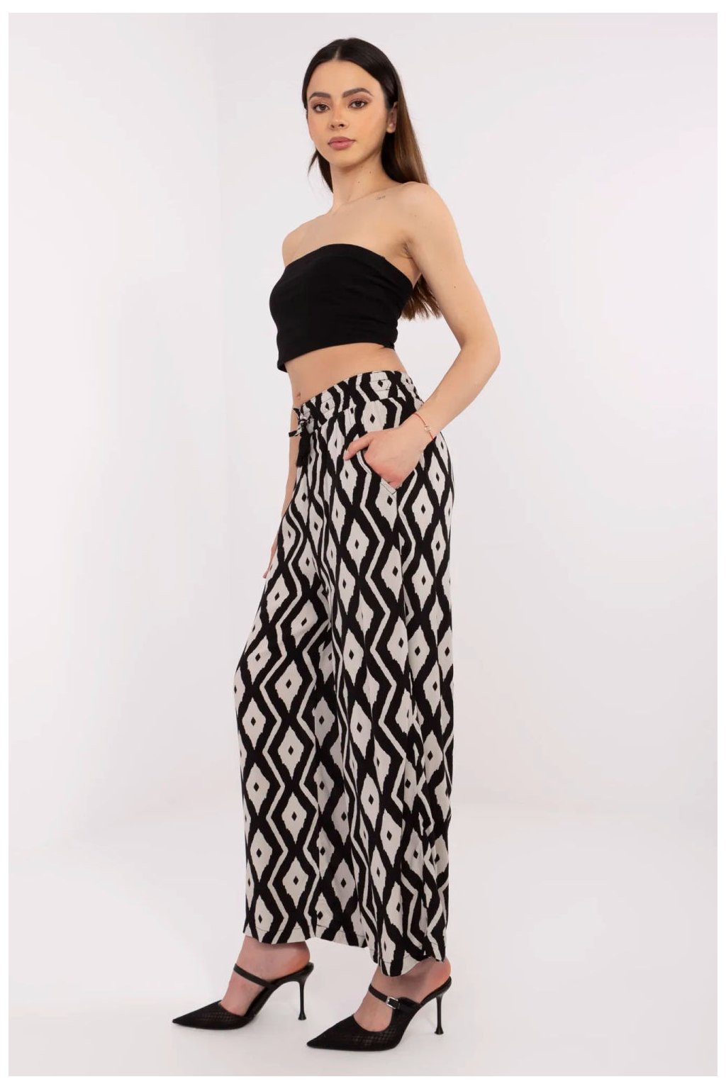 Lehké a pohodlné dámské kalhoty s casualovým charakterem jsou ideální volbou pro každodenní outfit. Vyrobené z prodyšné a šetrné vůči kůži viskózy, která patří do kategorie ekologického oblečení, spojují pohodlí nošení s péčí o životní prostředí. Vysoký pas a šněrování v pase zajistí skvělé padnutí a zdůrazní pas, zatímco široké nohavice dodají postavě lehkost. Ozdobný potisk přidává charakter a boční kapsy zvyšují funkčnost. Jedná se o skvělý návrh pro ženy, které ocení styl, pohodlí a uvědomělé výběry.