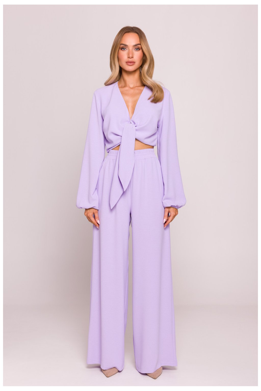 Elegantní a pohodlné kalhoty vyrobené z lehké látky s výraznou strukturou krepu a matným povrchem. Model s volným střihem a širokými, dlouhými nohavicemi poskytuje volnost pohybu a moderní vzhled, ideální jak na každodenní nošení, tak i pro elegantnější styly. Vysoký, elastický pas zajišťuje skvělé přizpůsobení postavě a je snadné je obléci bez zipu a knoflíků. Chybějící kapsy zdůrazňují jednoduchost a lehkost tvaru. Navrženo a vyrobeno v Polsku s ohledem na pohodlí a nadčasový styl.