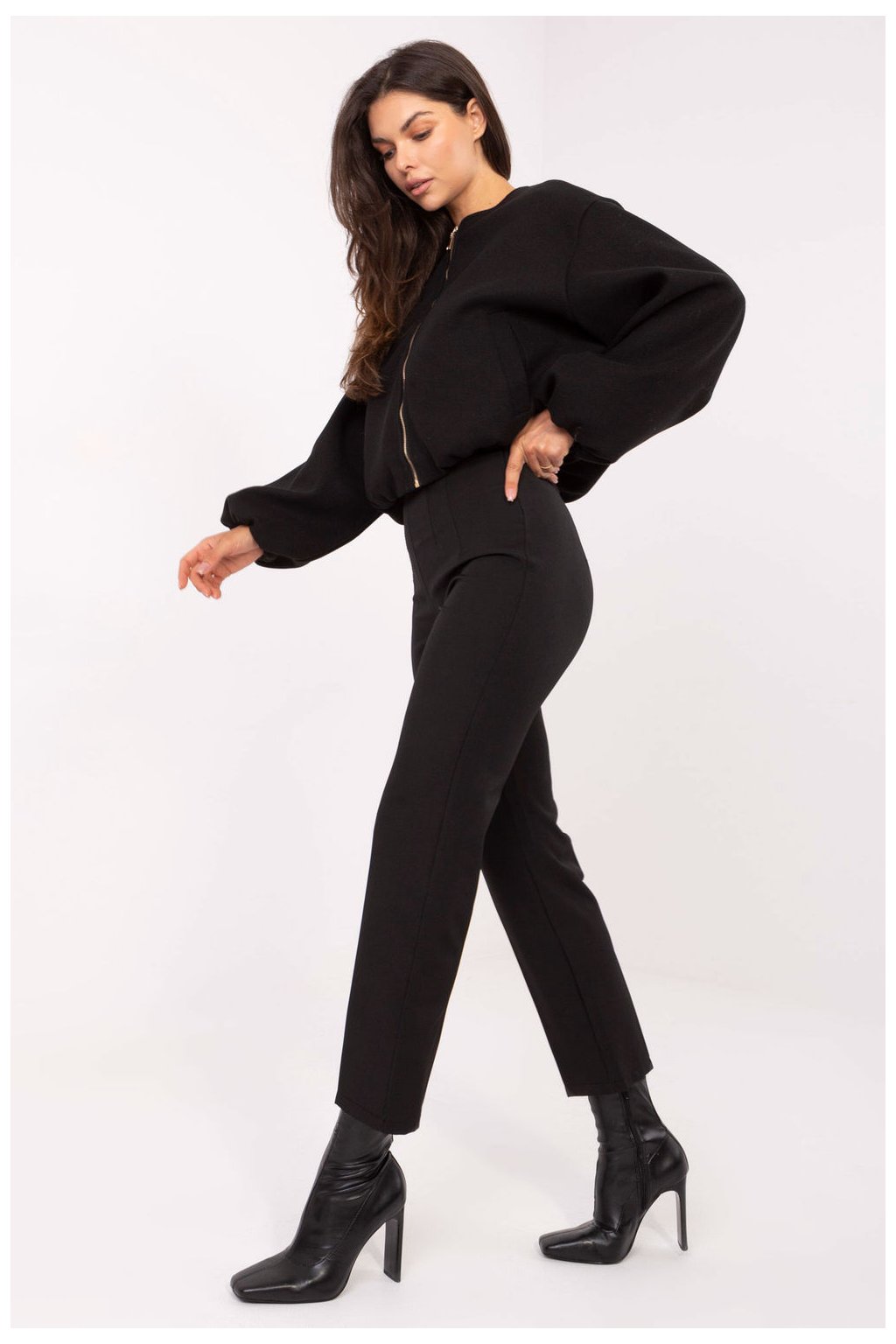 Elegantní dámské cigaretkové kalhoty jsou klasikou, která se hodí do mnoha stylizací, jak do každodenních, do práce, tak i na společenské události. Vyrobené z vysoce kvalitního polyesteru s přídavkem elastanu poskytují pohodlí nošení a jemně se přizpůsobují postavě. Model s vysokým pasem krásně zdůrazňuje pas, zúžené nohavice zjemňují nohy a celku dodávají elegantní charakter. Kalhoty se zapínají na skrytý zip umístěný na levé straně, což zaručuje estetické a elegantní dokončení. Minimalistický, hladký střih dělá z cigaretkových kalhot univerzální základ pro mnoho elegantních a moderních outfitů.