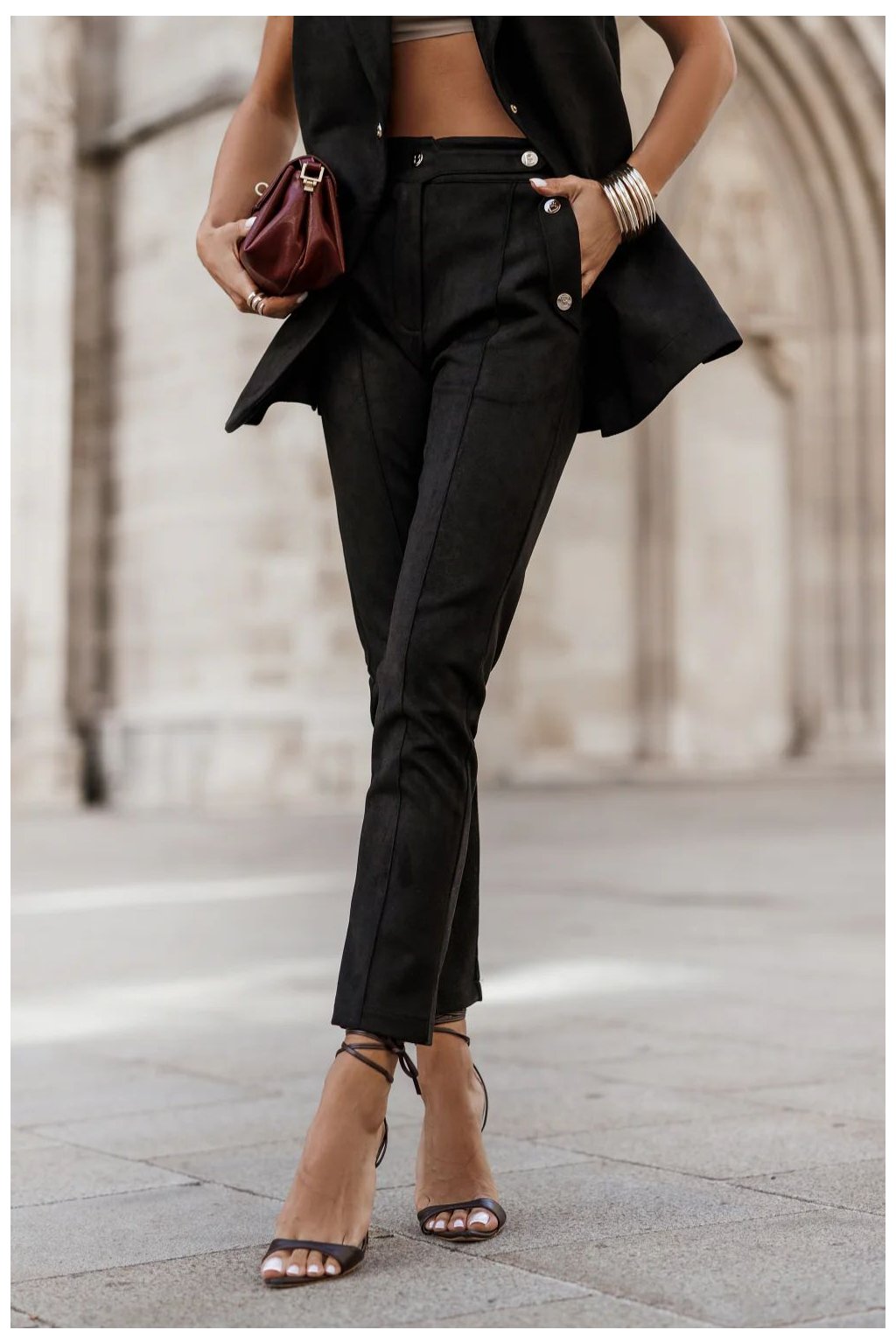 Kalhoty cigarety KIARA Černé jsou skvělou volbou pro ženy, které chtějí spojit eleganci s pohodlím. Tyto stylové kalhoty se hodí jak do každodenního stylu, tak i na formální příležitosti. Vyrobené z vysoce kvalitních materiálů zajistí skvělý vzhled a pohodlí po celý den. Model KIARA se vyznačuje moderním střihem, který zdůrazňuje siluetu a zároveň poskytuje volnost pohybu. Kalhoty mají délku 90 cm, co je skvělá kombinace s různými kousky oblečení, od košil až po svetry. Díky tomu je lze nosit v různých stylizacích, jak každodenních, tak i více sofistikovaných. Materiál, ze kterého jsou vyrobeny, je 95 % viskóza a 5 % elastan, co jim zajišťuje měkkost a pružnost. Viskóza dělá kalhoty příjemné na dotek a dobře odvádí vlhkost, což je obzvláště důležité v teplejších dnech. Navíc elastan zajišťuje, že kalhoty se ideálně přizpůsobí tělu, neomezují pohyb. Kalhoty jsou k dispozici ve třech velikostech, což umožňuje ideální přizpůsobení různým siluetám. Jak do práce, tak na večerní výlet, kalhoty cigarety KIARA budou skvělým doplňkem každého šatníku. Jejich klasická černá barva je velmi univerzální a snadno se kombinuje s ostatními kousky oblečení. Vsadte na eleganci a pohodlí s našimi kalhotami cigarety KIARA.