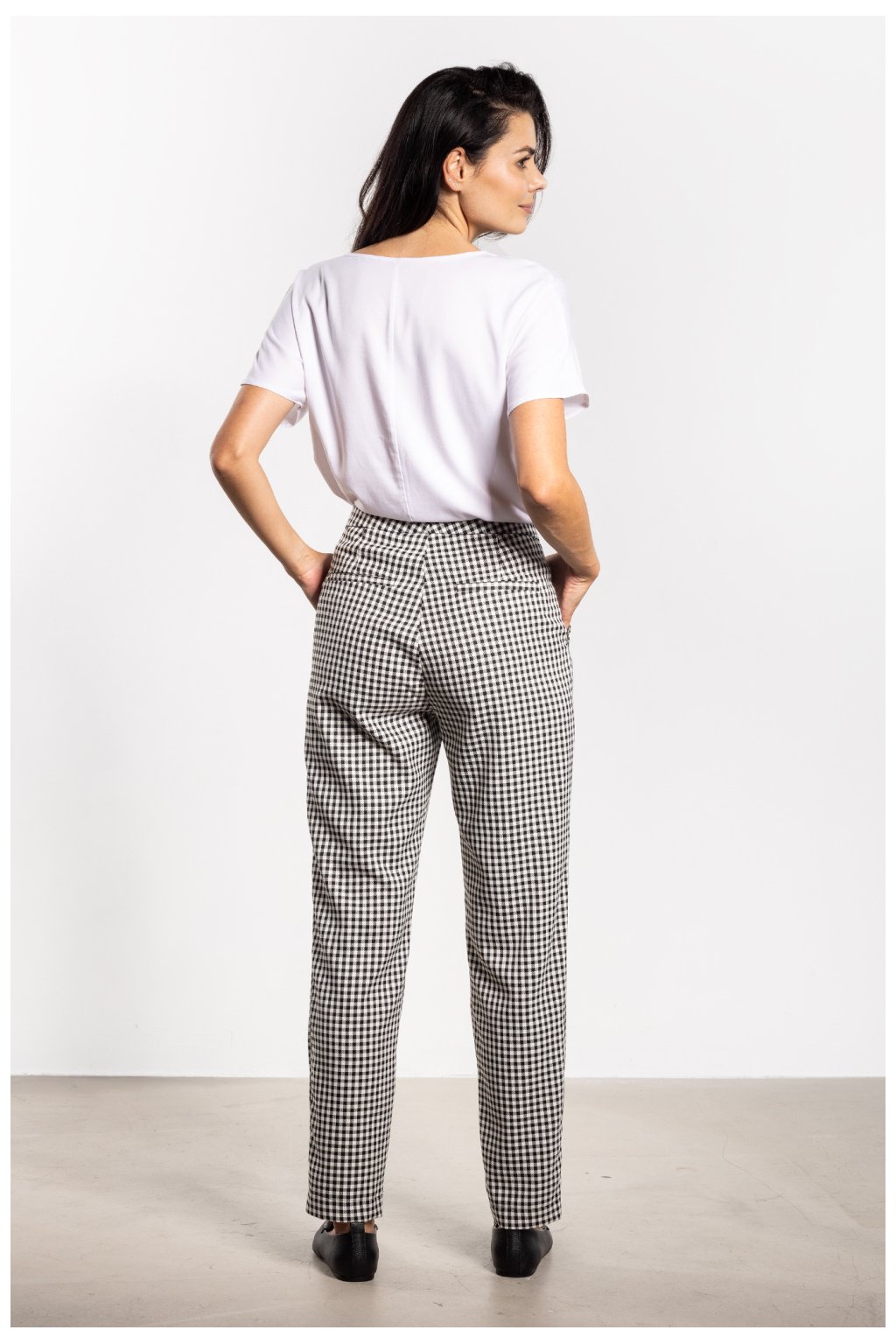 Elegantní cigaretové kalhoty v nadčasovém vzoru kříže spojují styl a pohodlí. Jednoduchý, přizpůsobivý střih krásně padne na postavě a střední výška pasu poskytuje pohodlí po celý den. Charakteristická křížovka dodává eleganci, díky čemuž se kalhoty hodí jak do kancelářských, tak každodenních stylizací. Praktické boční kapsy zvyšují funkčnost a univerzální design umožňuje kombinovat je s košilemi, svetry nebo sako, vytvářející různorodé, efektní vzhledy.