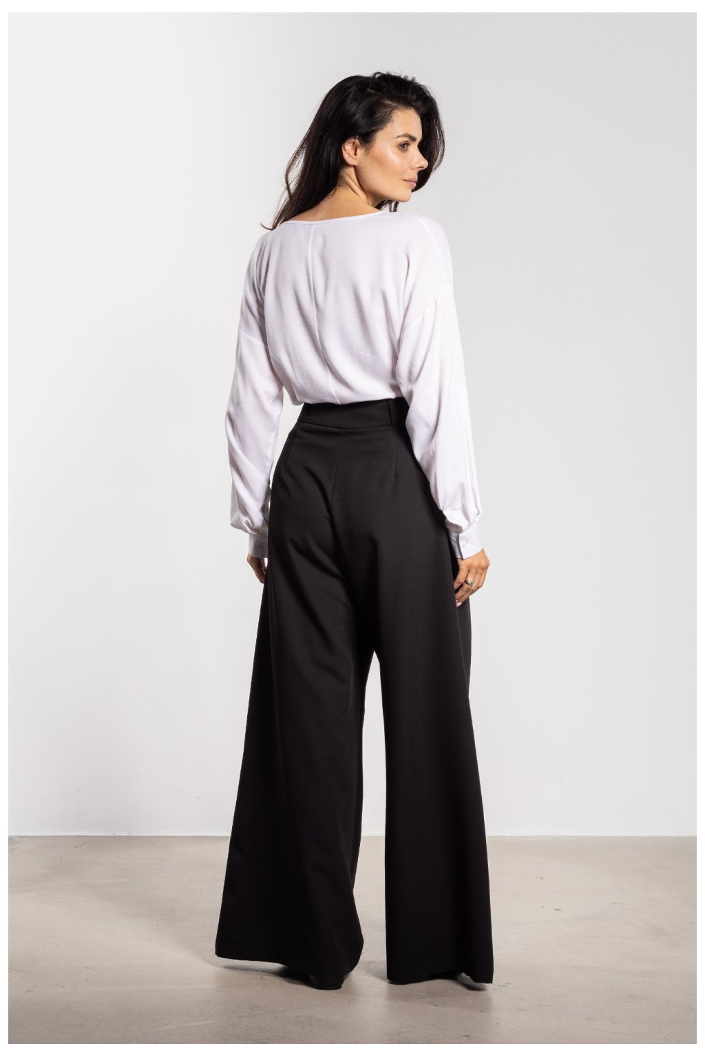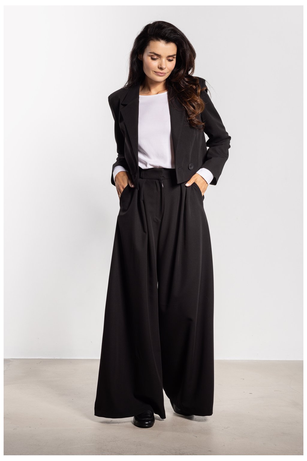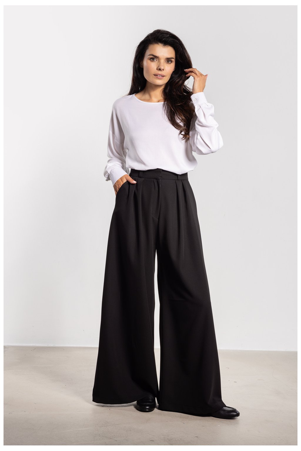 Elegantní kalhoty s širokými nohavicemi spojují pohodlí s elegancí. Vysoký pas zdůrazňuje pas a opticky prodlužuje siluetu, zatímco rozšiřující se nohavice dodávají lehkost a moderní charakter. Tento model se hodí jak do každodenních outfitů, tak do kancelářských nebo formálnějších kombinací. Skvěle ladí s sako, košilí nebo svetrem a praktické boční kapsy zvyšují funkčnost. Nadčasový střih umožňuje vytvářet mnoho módních kombinací a zaručuje univerzálnost.