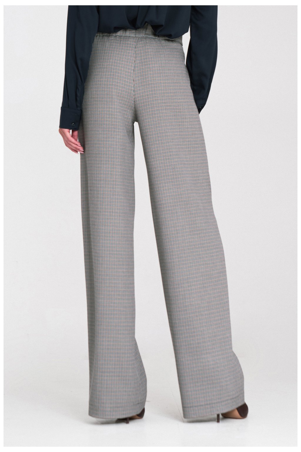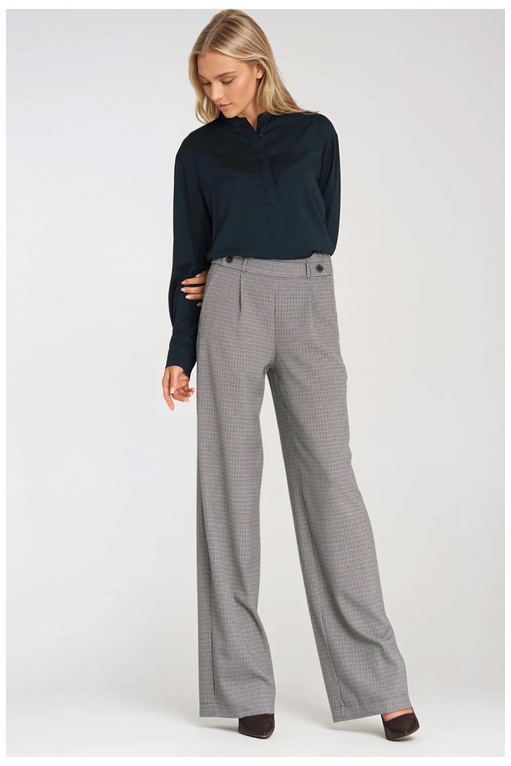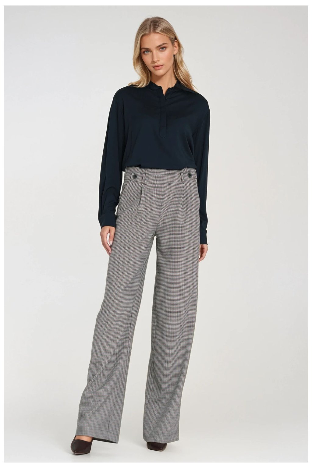 Stylové dámské kalhoty s volným střihem relaxed fit, vyrobené z materiálu s nepravidelnou barvou, který celku dodává jedinečný charakter. Model s vysokým pasem a ozdobnými záložkami vpředu, které jemně zdůrazňují pas. Široké, dlouhé nohavice typu wide leg dodávají postavě lehkost a eleganci. Pohodlí nošení zajistí gumový pas na zadní straně, který se dokonale přizpůsobuje postavě. V přední části jsou klasické kapsy a široký pás s ozdobnými knoflíky představuje efektní akcent, který kalhotům dodává ženský šarm. Ideální jak pro elegantní stylizace s sako, tak i v každodenní verzi s jednoduchým topem nebo košilí.