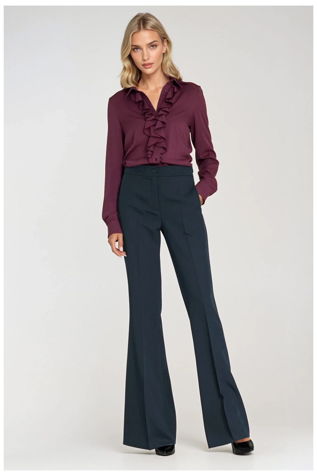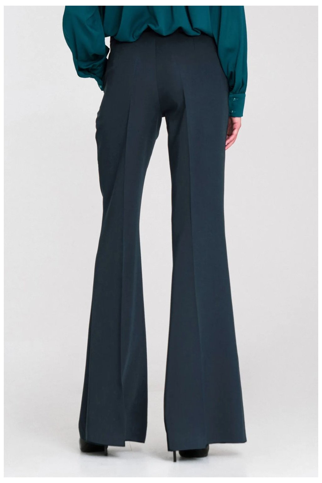 Elegantní dámské kalhoty s přiléhavým střihem a středním pasem, které zdůrazňují postavu a zachovávají elegantní charakter. Model s nohavicí se silně rozšiřující se od kolena dolů, což opticky prodlužuje nohy a dodává celku módní, ženský vzhled. Vpředu a vzadu jsou kalhoty s přehnutými lemiky, které jim dodávají eleganci a profesionální vzhled. Kalhoty mají zip a knoflík a klasické kapsy vpředu. Univerzální model, který se skvěle hodí jak do kancelářských stylizací, tak do elegantních outfitů na každý den.