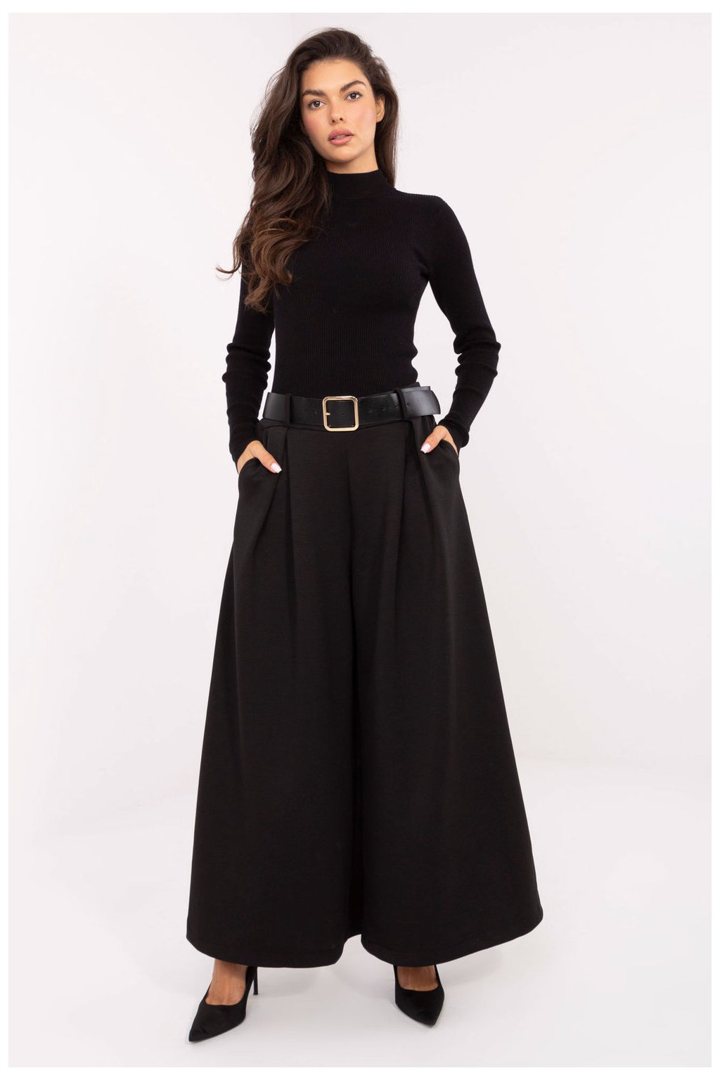 Elegantní dámské kalhoty typu palazzo, skvělé na každý den i do práce. Vyrobena z směsi viskózy a polyesteru, vynikají hladkou strukturou a pohodlným nošením. Vysoký pas s gumou a zapínacím páskem zdůrazňuje pas, a ozdobné záložky dodávají celku eleganci. Široké nohavice dodávají lehkost postavě a praktické boční kapsy s vložením zajišťují funkcionalitu. Stylový návrh, který spojuje eleganci s pohodlím.