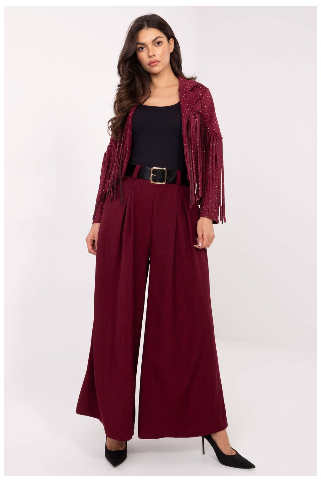 Elegantní a pohodlné dámské kalhoty palazzo vyrobené z vysoce kvalitní směsi viskózy a polyesteru, které spojují eleganci s pohodlím nošení každý den do práce. Hladký materiál dodává kalhotám klasický, rafinovaný charakter a dlouhé, široké nohavice opticky prodlužují siluetu, vytvářejí lehký a ženský vzhled. Model má vysoký pas s všitou gumou pro ideální přizpůsobení a záložky na přední straně, které decentně zdůrazňují pas. Další výhodou je zapínací pásek, který umožňuje přizpůsobit kalhoty postavě a přidat outfitu rafinovaný akcent. Jedná se o univerzální návrh, který se skvěle hodí jak do každodenních, volných outfitů, tak do vizitkových, elegantních stylizací do práce nebo na speciální příležitosti.
