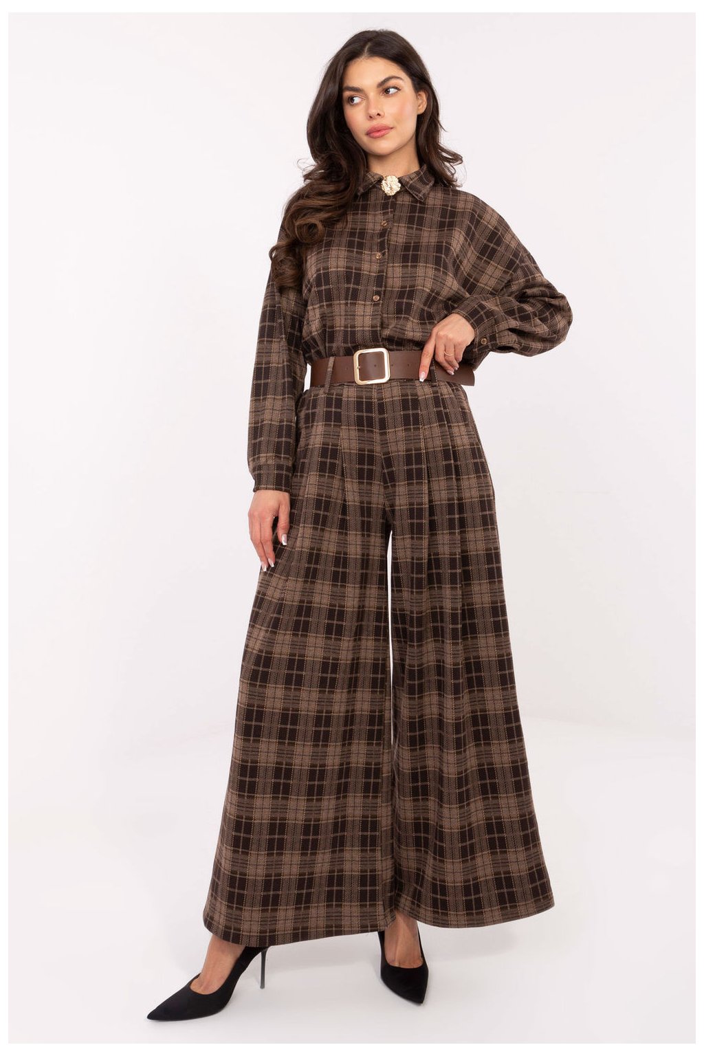 Moderní a pohodlné dámské flanelové kalhoty typu palazzo s casual charakterem, ideální pro každodenní styling. Vyrobené z vysoce kvalitní směsi polyesteru, viskózy a elastanu, poskytují pohodlí, lehkost a jemnou pružnost, díky čemuž se skvěle přizpůsobují postavě. Model má vysoký pas a široké nohavice typu palazzo, které opticky prodlužují nohy a dodávají postavě lehkost. Boční kapsy a zapínací pásek přidávají praktičnost a umožňují zdůraznit pas. Kalhoty mají kostkovaný vzor, který přináší klasický, nadčasový akcent, a absence zapínání zajišťuje, že jsou mimořádně pohodlné a snadno použitelné. Jedná se o univerzální model, který se skvěle hodí jak do každodenních, casual stylizací, tak do více elegantních setů do práce.