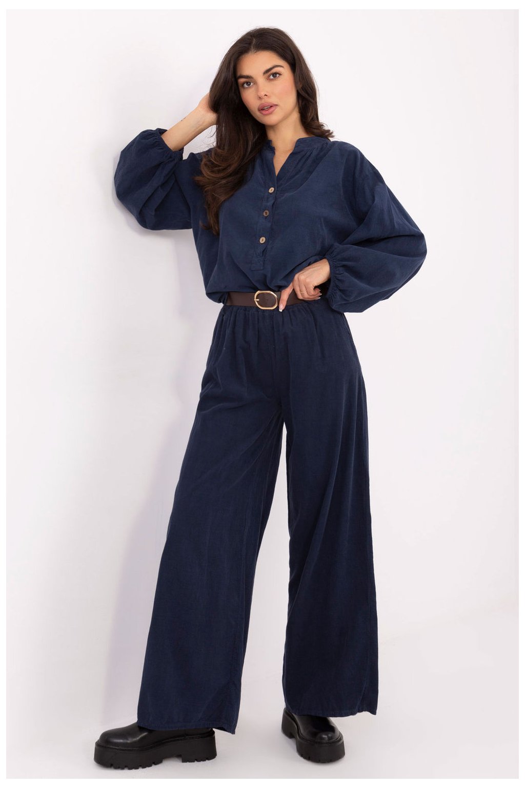 Elegatní sametové kalhoty v casual stylu, ideální na každý den. Vyrobené z měkkého materiálu s vysokým obsahem polyesteru, poskytují pohodlí a pohodlí po celý den. Model má vysoký pas s vsazenou gumou v pase, která zaručuje perfektní přizpůsobení siluetě a pohodlí při pohybu. Široké nohavice typu wide leg dávají kalhotám moderní, lehce retro charakter, a vložené boční kapsy jim dodávají praktičnost. Celkový vzhled doplňuje zapínací pás, který zdůrazňuje pas a dokončuje stylový vzhled. Tyto materiálové kalhoty jsou skvělou volbou pro ženy, které ocení volnost a elegantní minimalismus ve svých každodenních stylizacích.