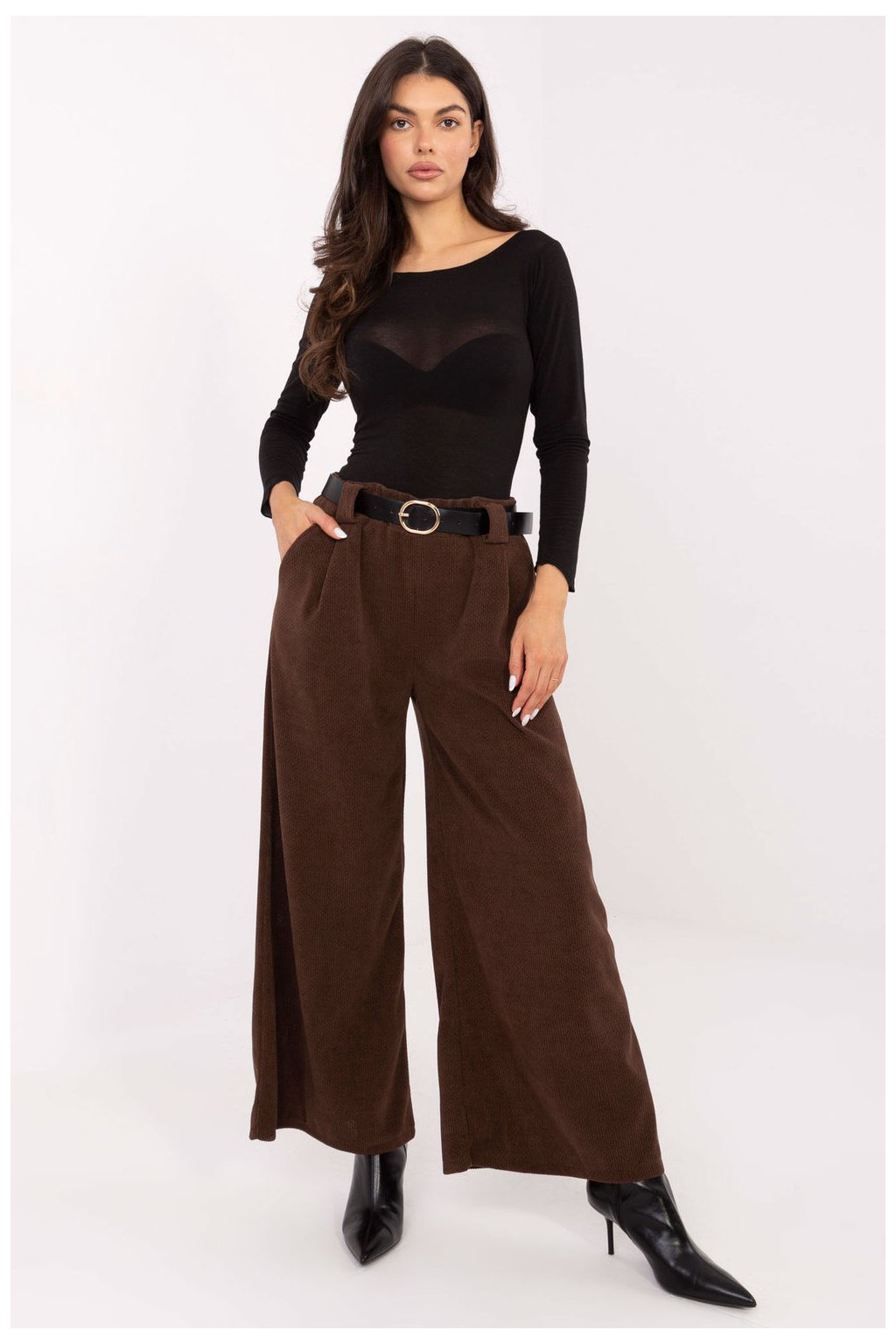 Elegantní látkové kalhoty s elegancí, ideální na každodenní nošení i do práce. Vyrobené z měkkého žíněného materiálu s různými texturami, poskytují výjimečný komfort nošení a stylový vzhled. Model má vysoký pas a široké nohavice, které se krásně přizpůsobují postavě, opticky ji zúžují. V pasu je vsazena elastická guma, která zaručuje pohodlné přizpůsobení, a zapínací pásek umožňuje další regulaci obvodu. Kalhoty nemají zapínání, co zvyšuje komfort užívání. Boční kapsy přidávají funkčnost a eleganci. To je skvělá volba pro ženy, které ocení spojení elegance, pohodlí a moderního stylu.