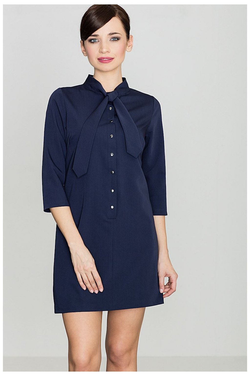 Mini šaty z měkké tkaniny. Rovný střih se 3 rukávy, zapínání vpředu na patentky. Hluboký výstřih je zakončen vázanou šerpou. To dodává šatům více ženského charakteru.Viskóza 35 %