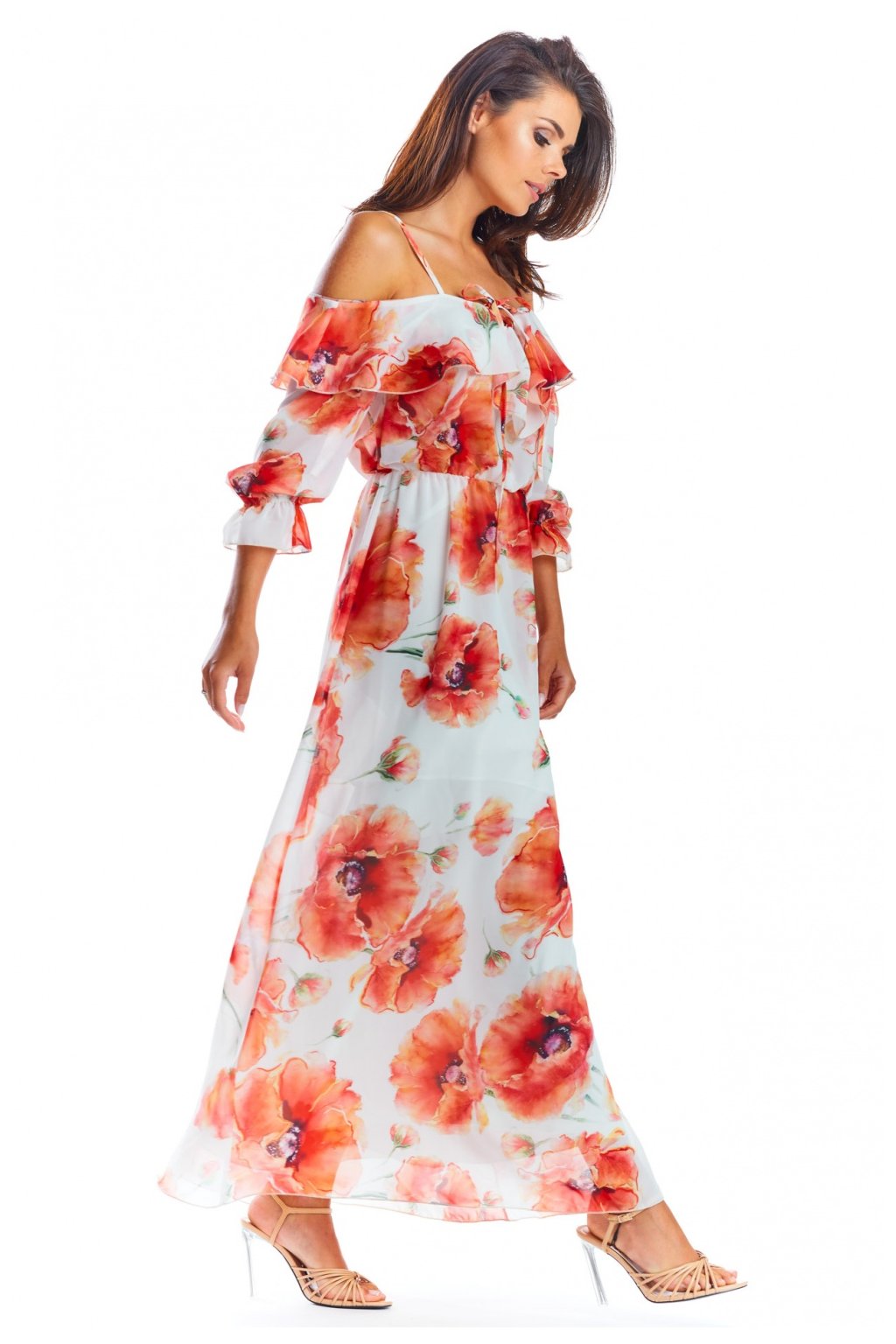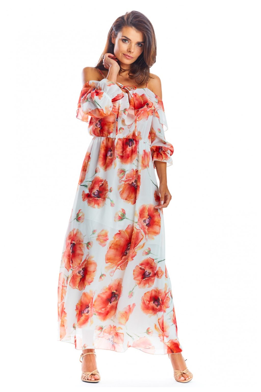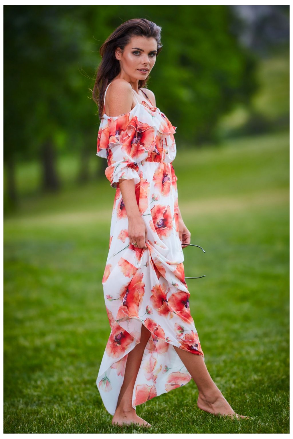 Maxi šaty s výstřihem ve španělském stylu. Vrchní část šatů zdobí volánek a vázačka, díky níž lze upravit výstřih. Pružný pásek zvýrazňuje pas. Šaty jsou vyrobeny ze vzdušného šifonu, který se při chůzi krásně natáhne. Spodní část šatů na podšívce. Výrobek vyrobený v Polsku.Polyester 97 %