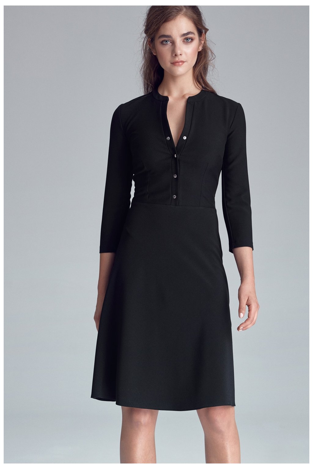Šaty rovného střihu se zapínáním na knoflíky vpředu. Model má 3/4 rukávy a délku ke kolenům. Šaty v jemném kancelářském stylu dokonale doplní podzimní a zimní kancelářský šatník. Šaty jsou bez podšívky, zapínají se na patentky a zip na boku.Polyester 64 %