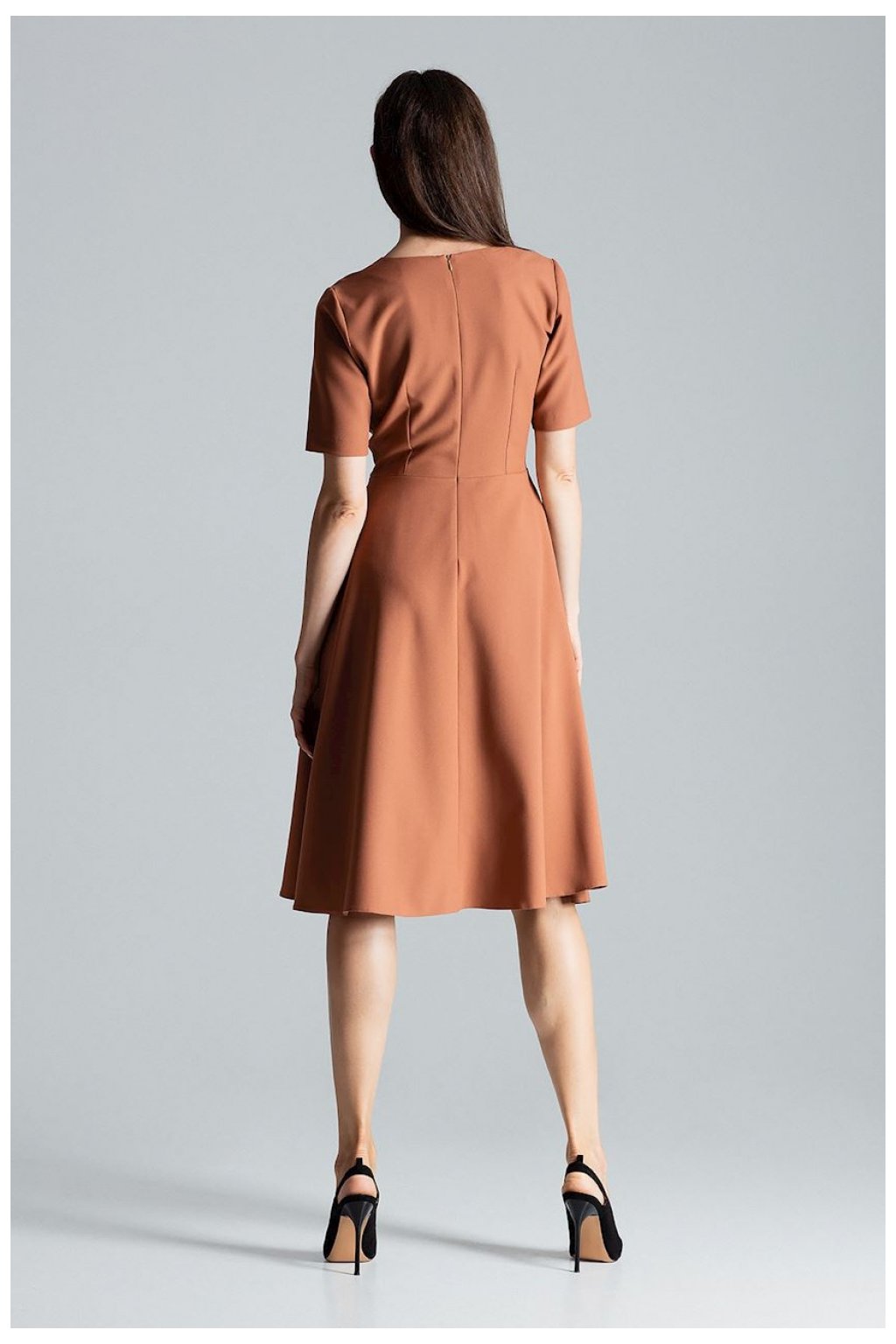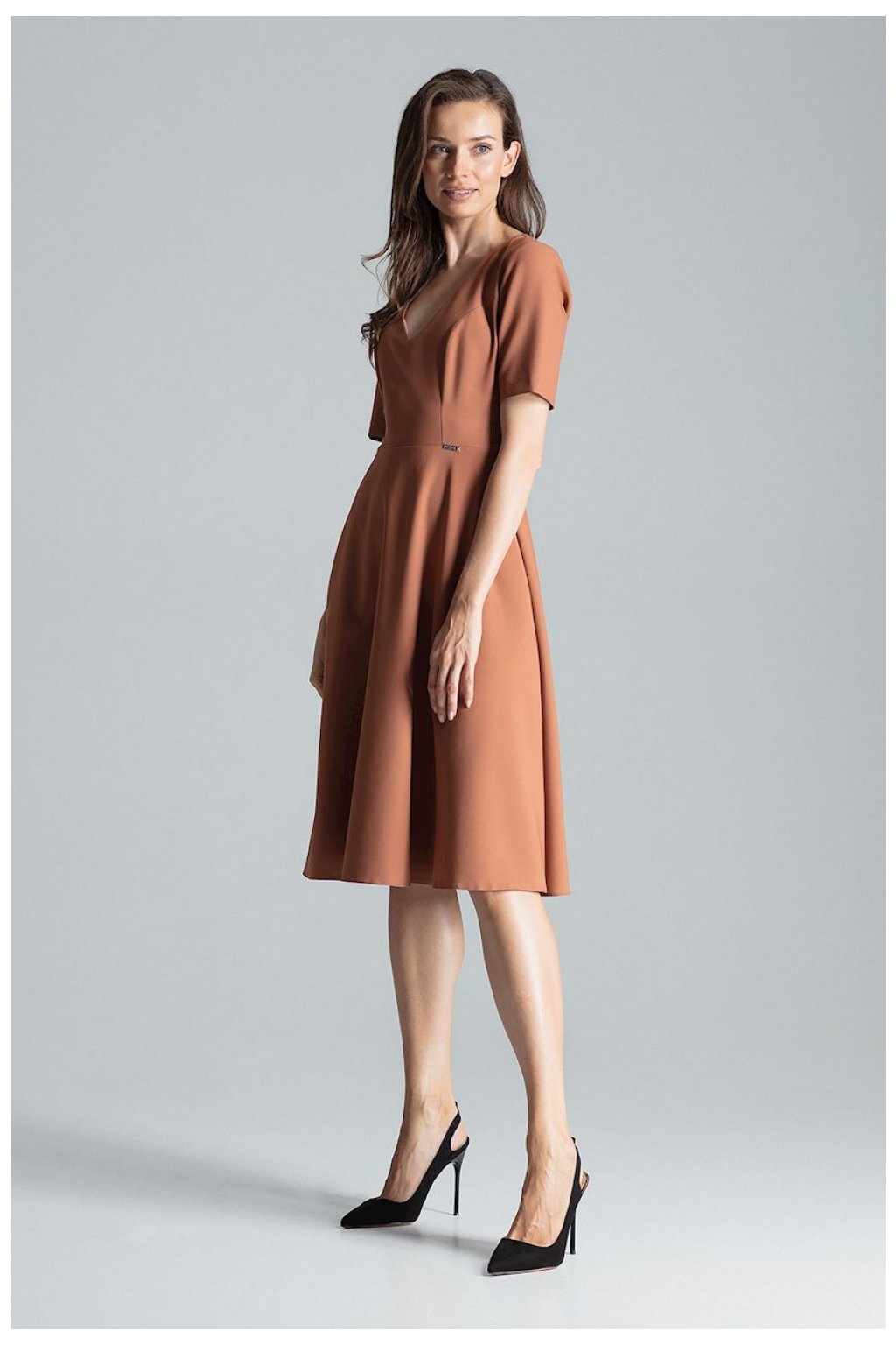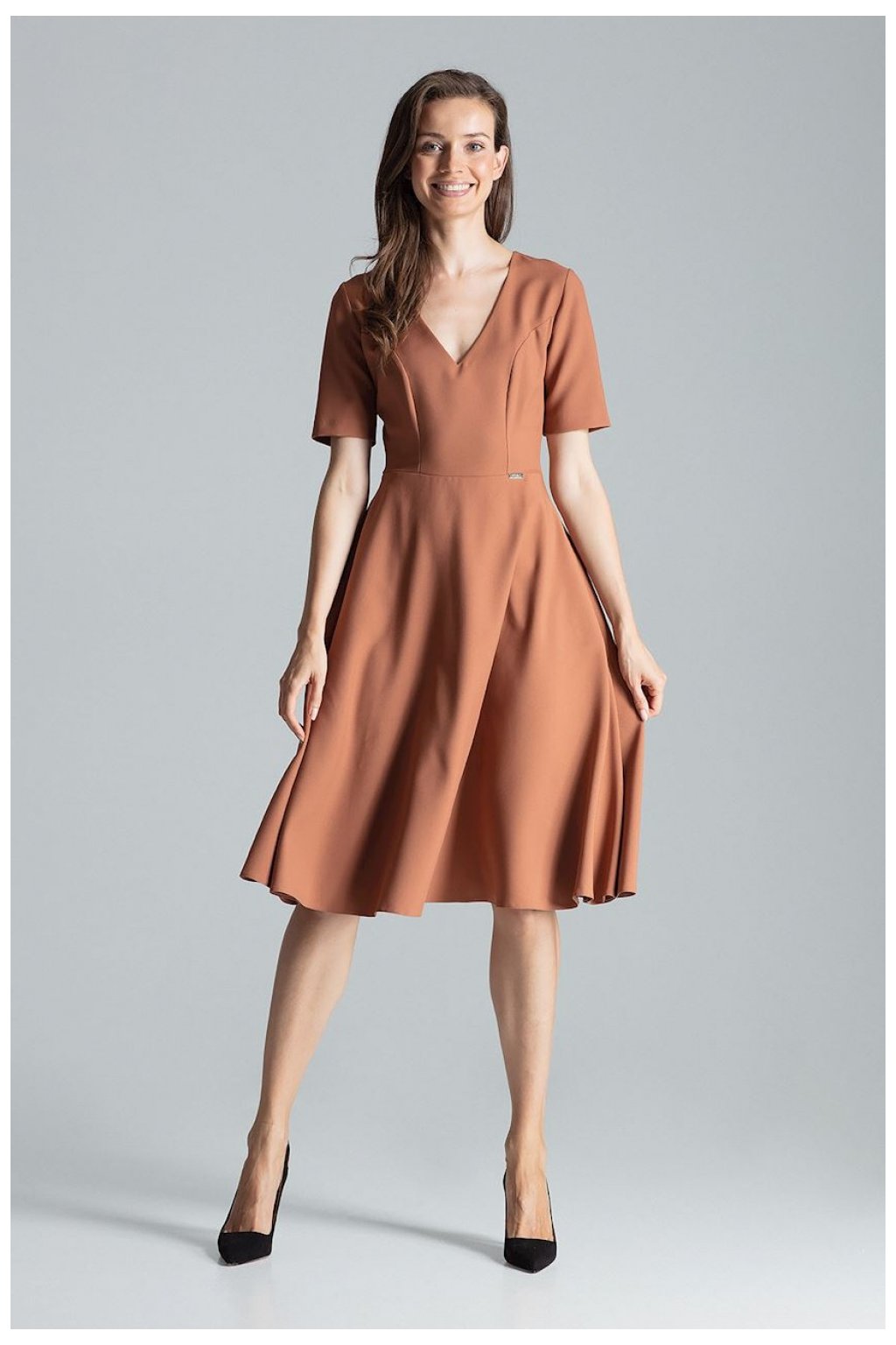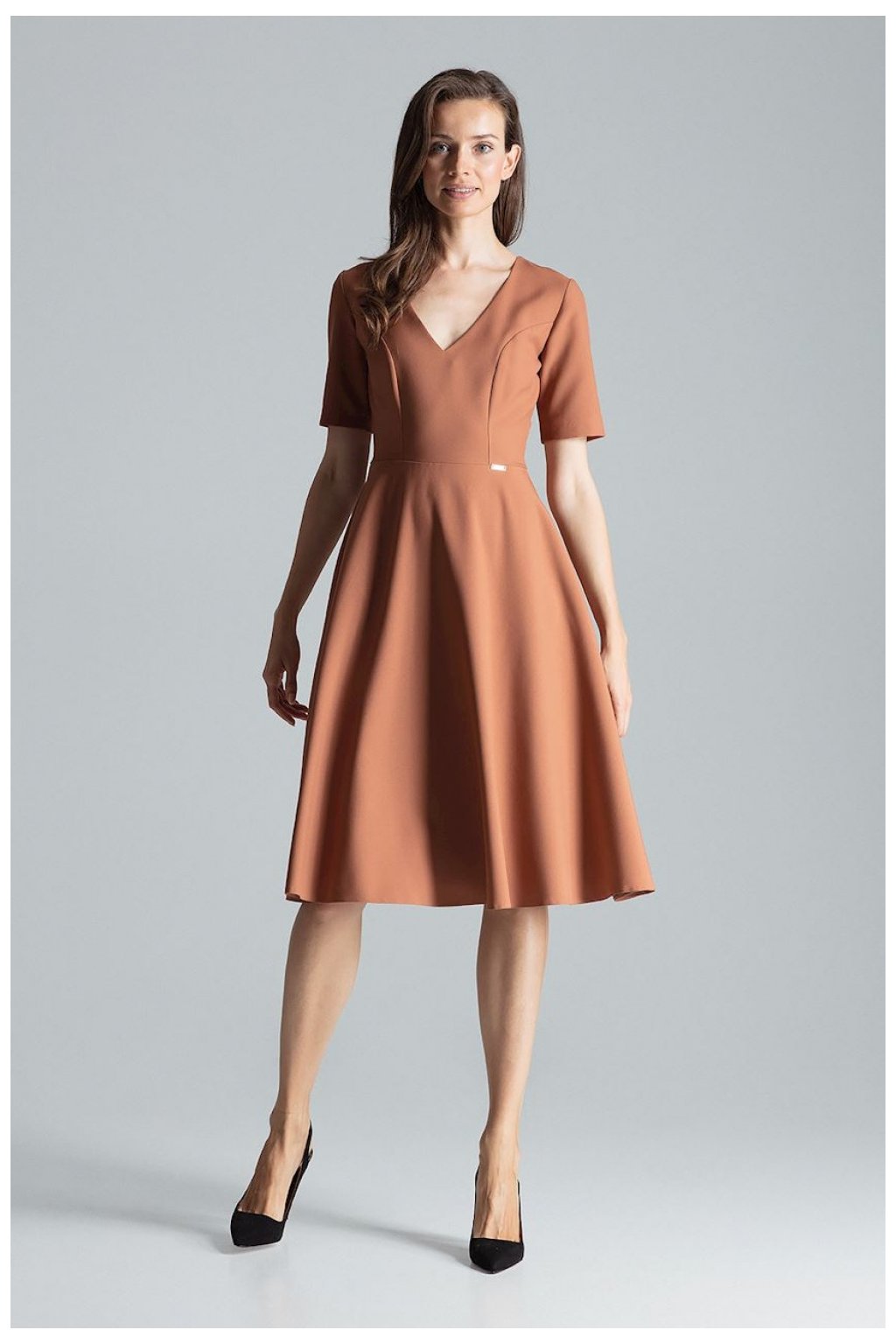 Hnědé midi šaty s krátkými rukávy, bez podšívky, se srdíčkovým výstřihem. Šaty v pase přestřižené, rozšířené. S bočními kapsami ve švech. Zapínání na zip na zadní straně.| Velikost | Délka | Obvod beder | Obvod prsou | Obvod v pase |