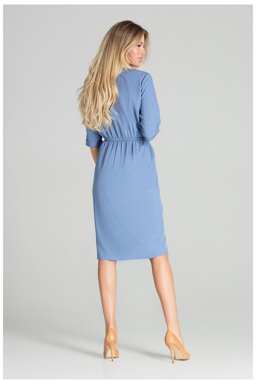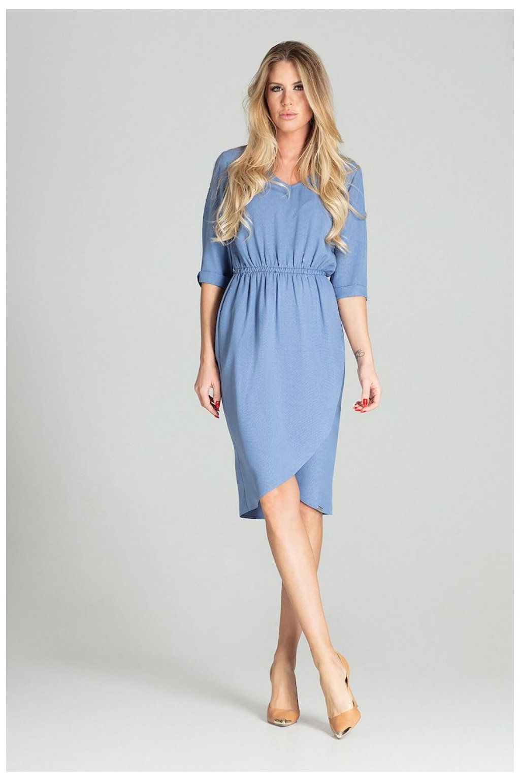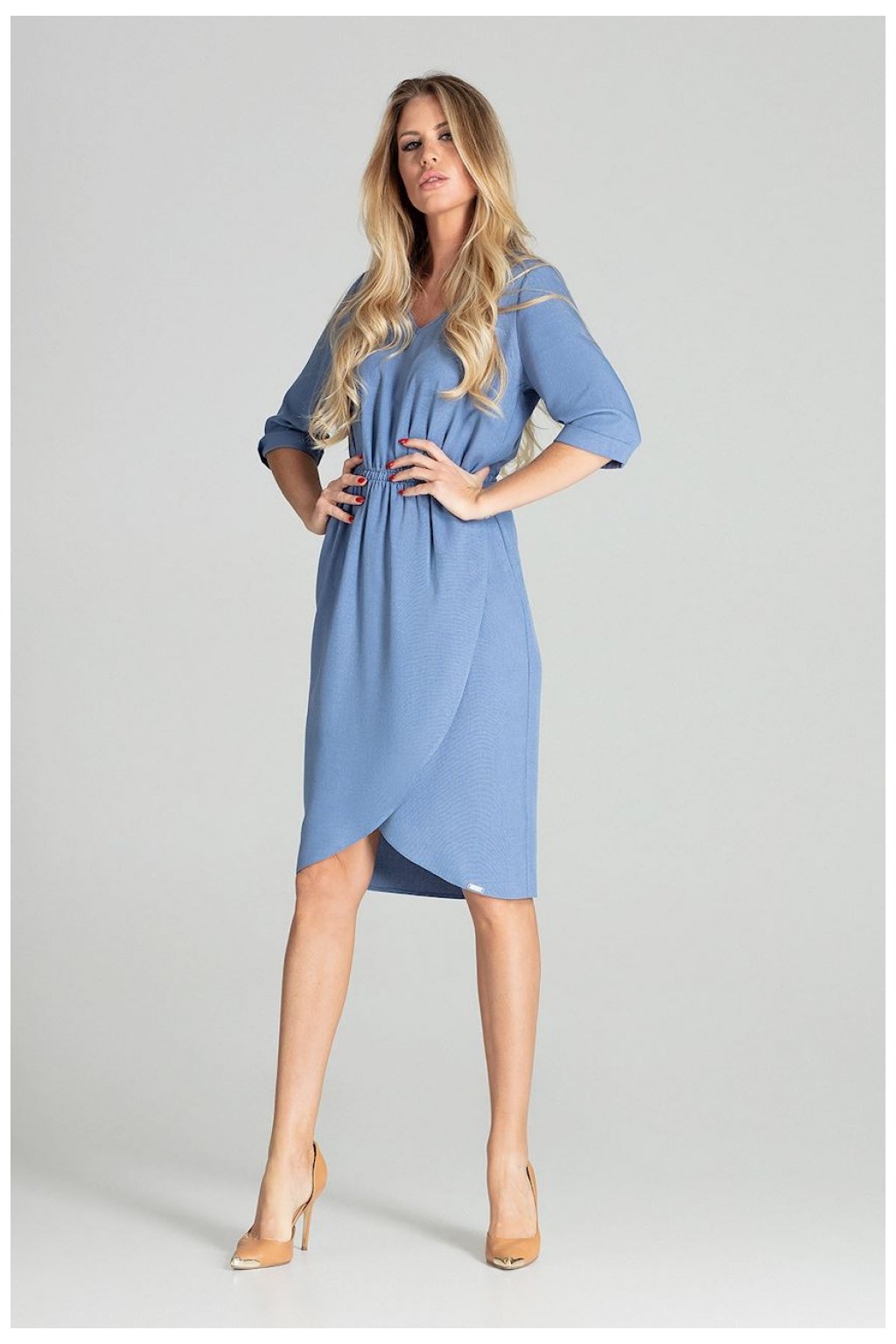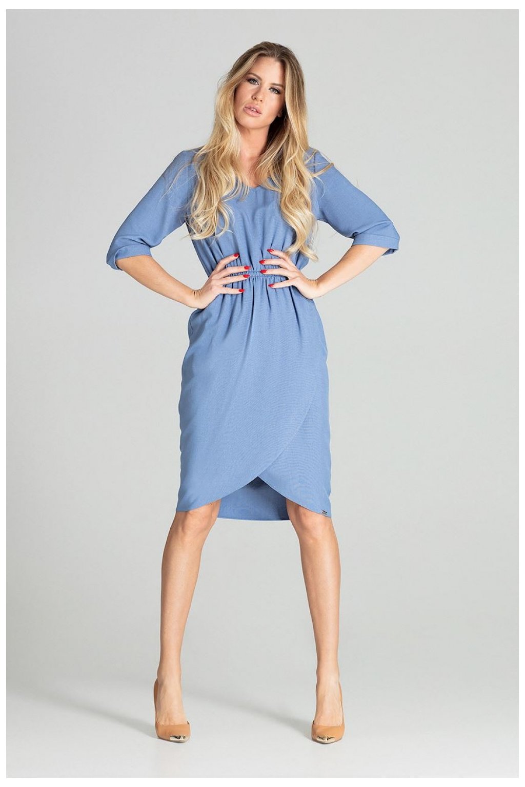 Elegantní šaty s 3/4 rukávy a volánky. Model působí nádherně a expresivně. Jednoduchý, originální tvar obepíná siluetu a dodává jí romantiku.