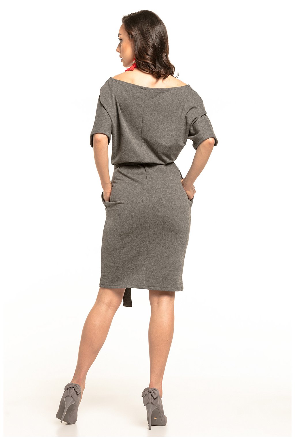 Midi šaty z příjemného bavlněného úpletu s širokým lodičkovým výstřihem a 3/4 rukávy. Horní část šatů má kimonový střih, spodní část má tužkový střih. Navíc ozdobný pletený pásek v barvě šatů. Materiál je pružný. Náš návrh na každý den.Elastan 8 %