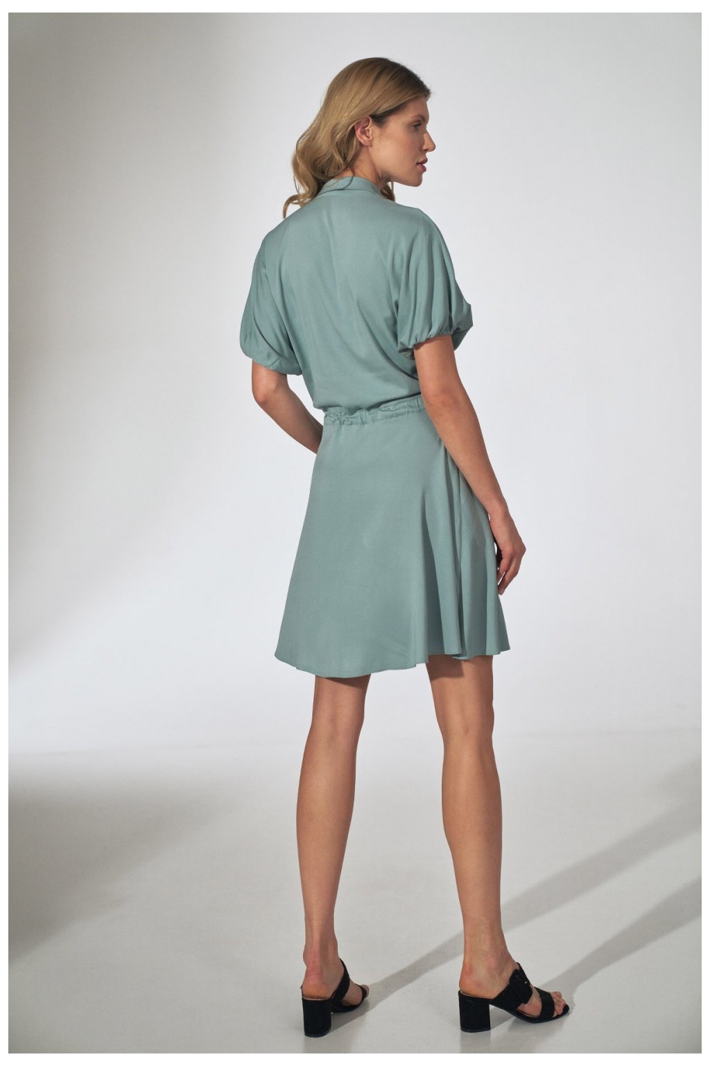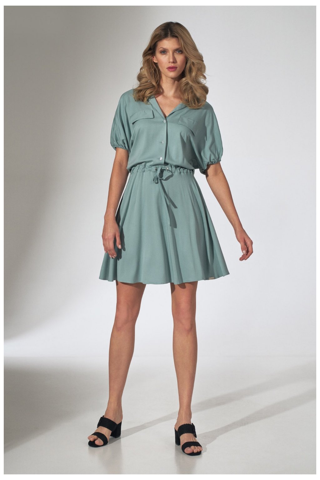 Mátové kimonové mini šaty s límečkem. Ozdobné nášivky na linii prsou, zapínání na 3 knoflíky, stahovací šňůrka v pase. Rukávy zakončené gumičkou. Spodní díl rozšířených šatů. Kapsy v bočních švech. Bez podšívky.Viskóza 97 %