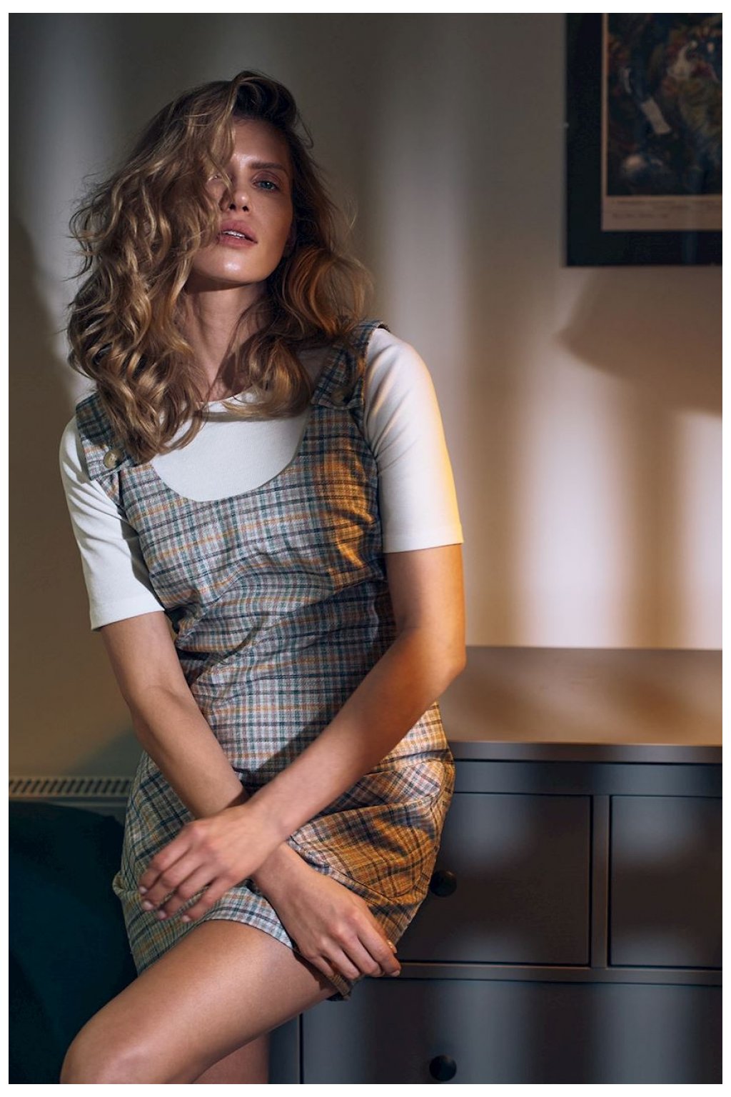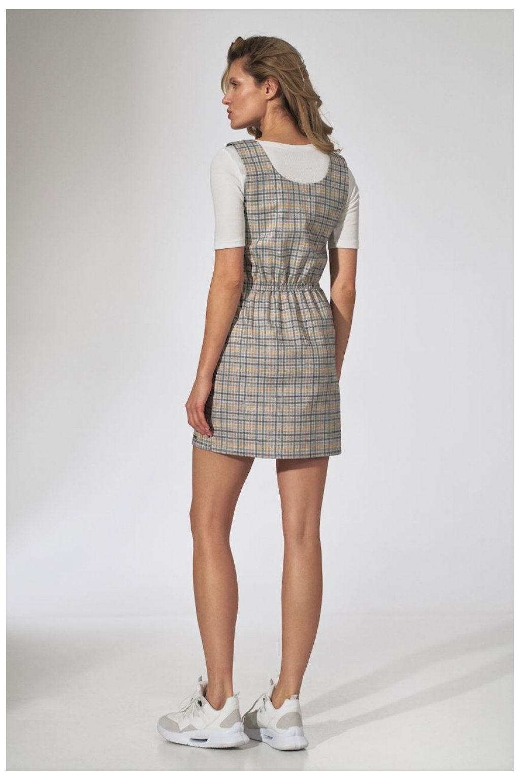Kostkované midi šaty se šlemi, zapínané na velké ozdobné knoflíky. Skládá se na linii prsou. Vpředu jsou našité velké ozdobné kapsy. Bez podšívky. Mírně rozšířená spodní část.Viskóza 28 %