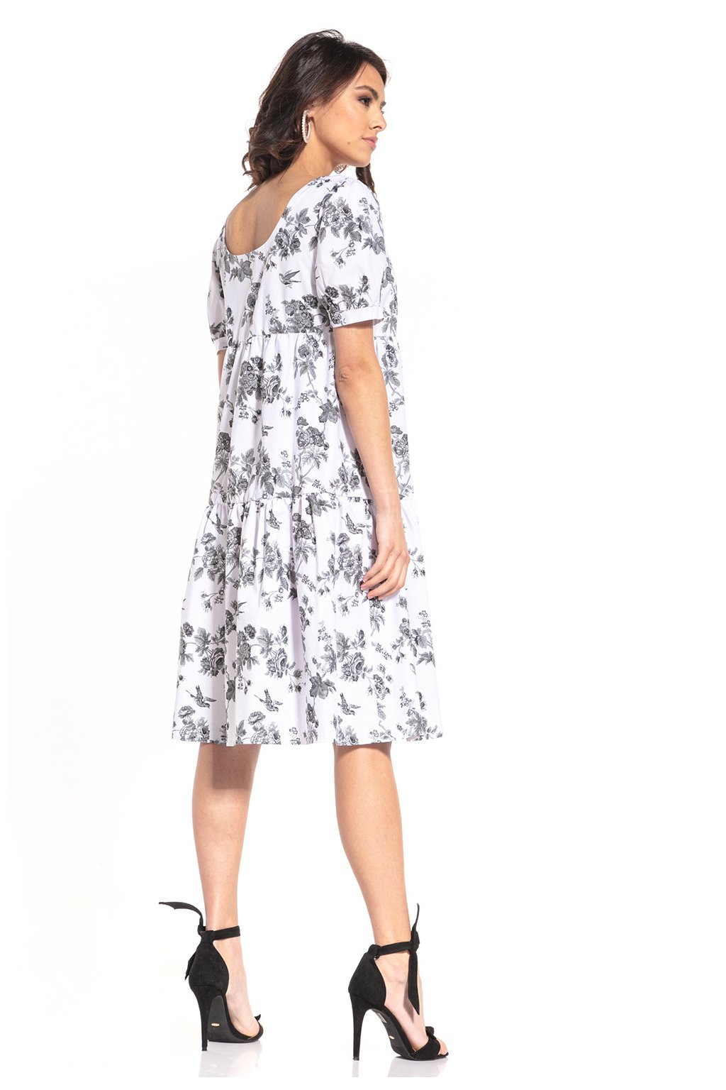 Šaty v délce ke kolenům s dlouhými rukávy a velkými lemovanými klopami ve výstřihu. Model má v pase geometrickou kostici s rozparkem na zádech pro…