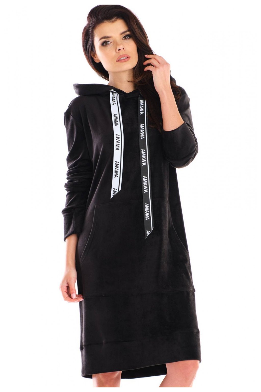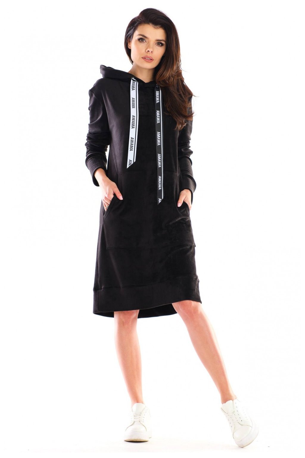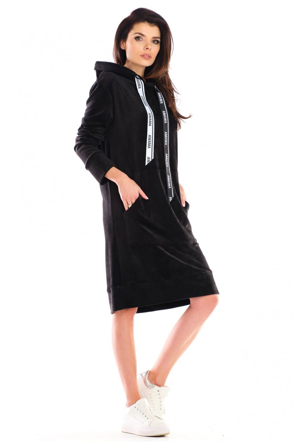 Velurové šaty v midi délce. Šaty mají na přední straně mimořádně praktickou velkou kapsu. Pásky s logem značky dodávají šarm. Můžete ji použít jako šaty nebo jako delší halenku ke kalhotám či legínám. Materiál, z něhož je vyroben, je velmi příjemný na dotek a při kontaktu s tělem. Výrobek byl navržen a vyroben v Polsku.Polyester 95 %