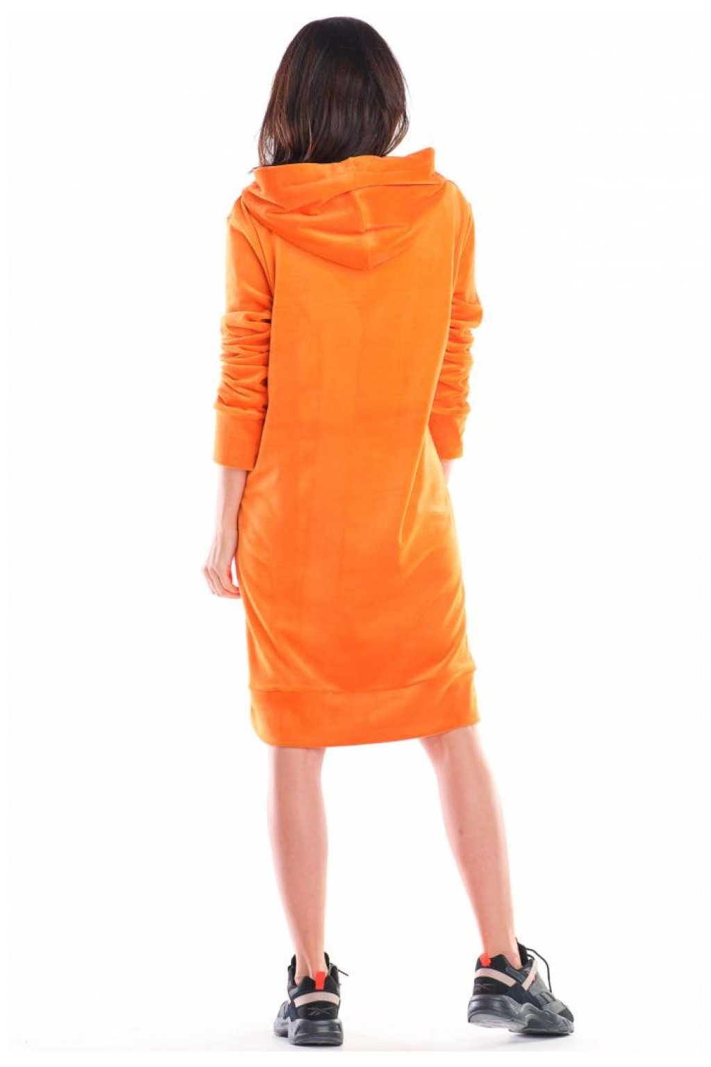 Velurové šaty v midi délce. Šaty mají na přední straně mimořádně praktickou velkou kapsu. Pásky s logem značky dodávají šarm. Můžete ji použít jako šaty nebo jako delší halenku ke kalhotám či legínám. Materiál, z něhož je vyroben, je velmi příjemný na dotek a při kontaktu s tělem. Výrobek byl navržen a vyroben v Polsku.Polyester 95 %