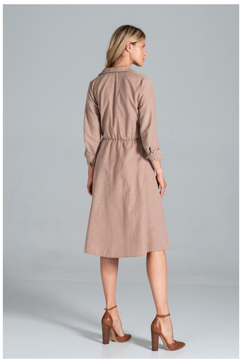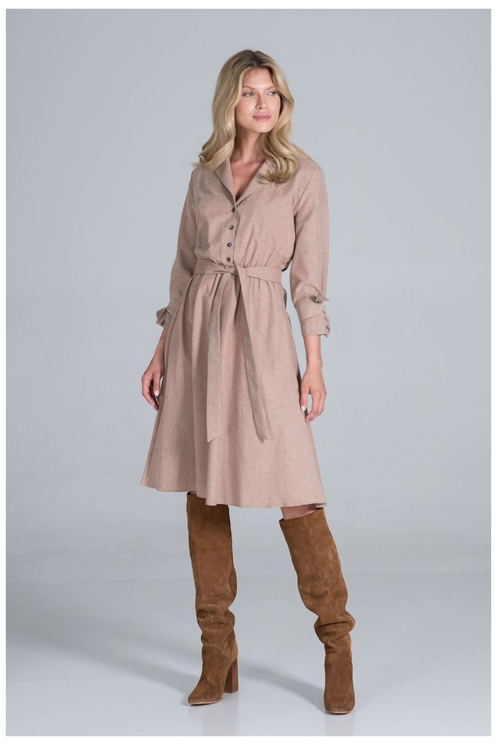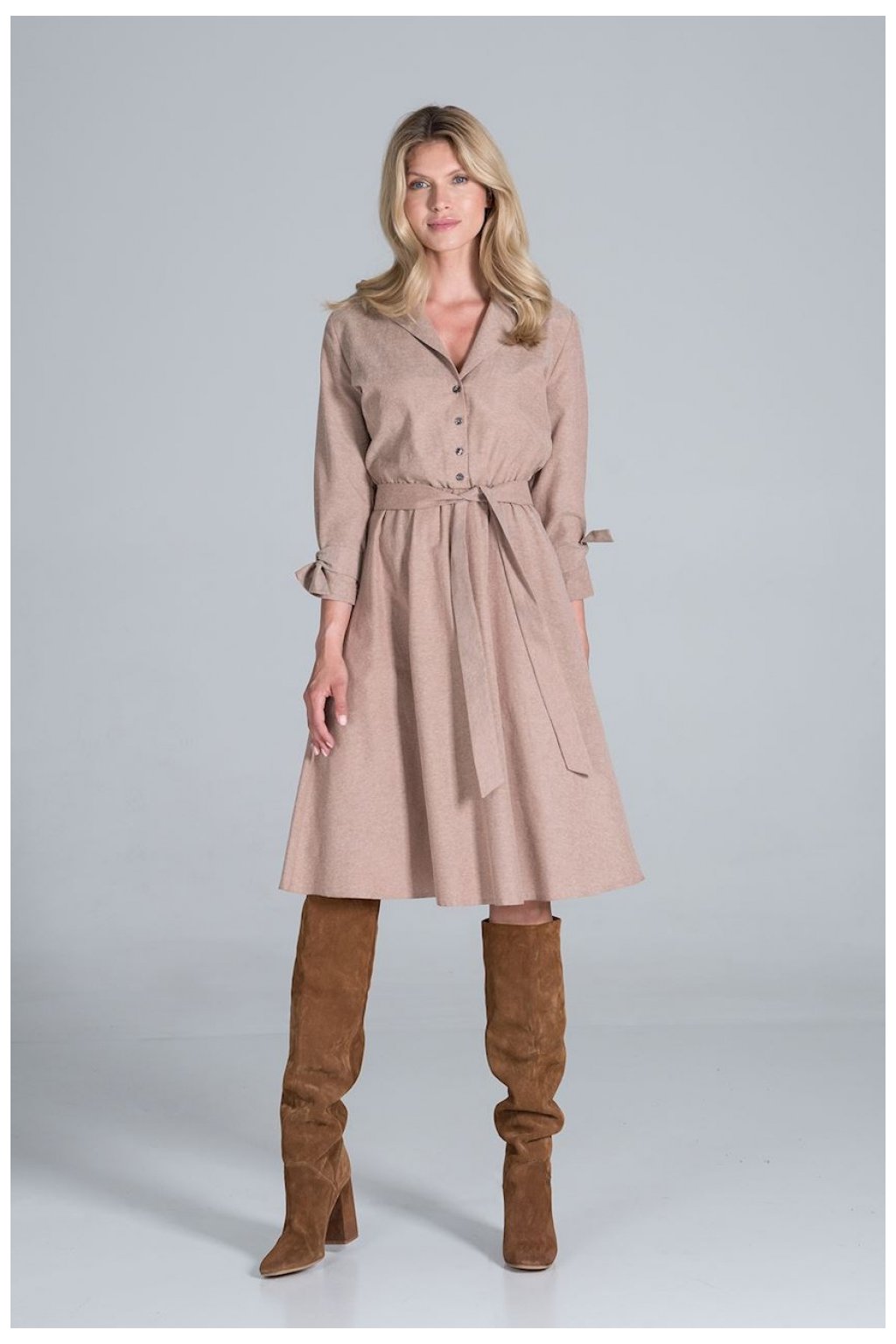 Midi šaty se sakovým límcem s výstřihem do V, zapínají se do poloviny na knoflíky, mají 7/8 rukávy se zavazováním. Pas s gumičkou a páskem na zavázání, dole rozšířený.Polyester 45 %