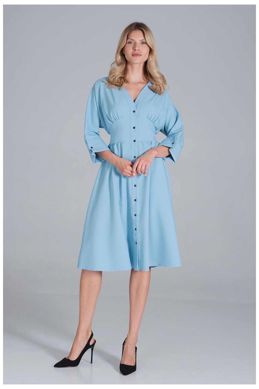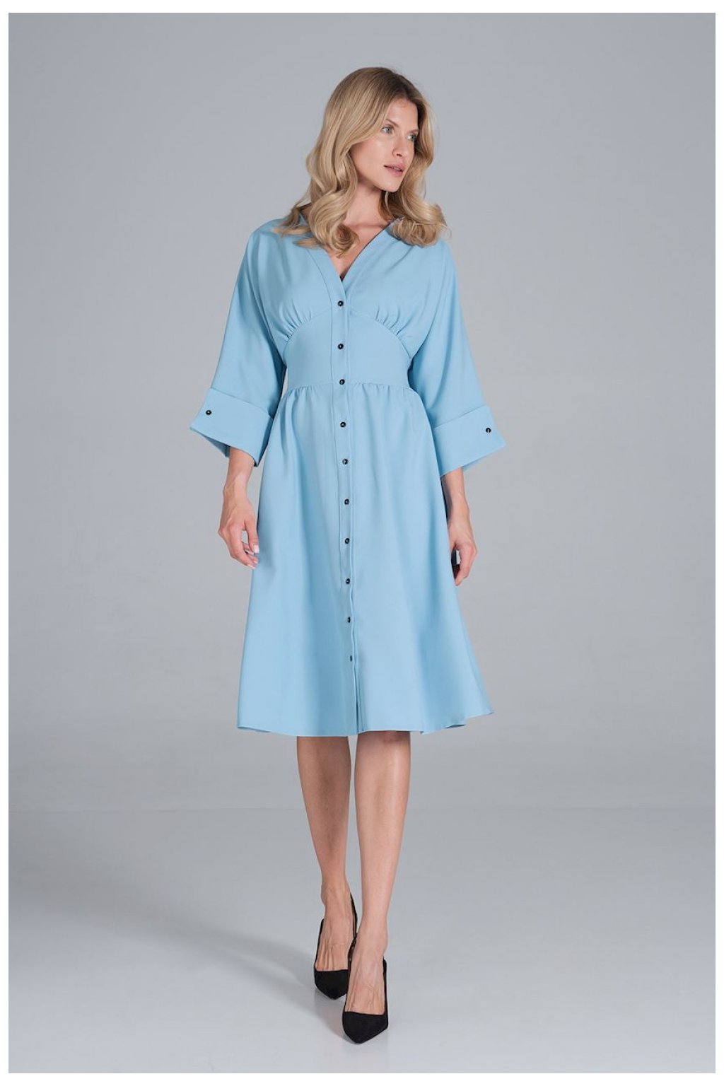 Midi šaty se srdíčkovým výstřihem, zapínáním na knoflíky a kimonovým vrškem. Rukávy 3/4 zakončené širokou manžetou. Široký výstřih v pase. Spodní část se rozšířila. Šaty bez podšívky.| Velikost | Délka | Obvod beder | Obvod prsou | Obvod v pase |