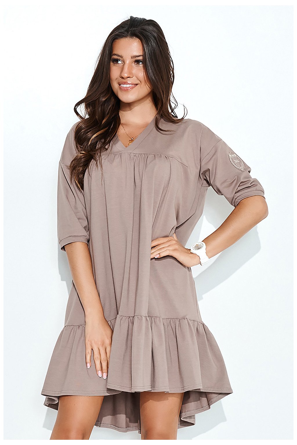 Oversize šaty z lehké a vzdušné pletené mikiny. Má srdíčkový výstřih a rukávy zakončené tenkým žebrovaným lemem. Na jednom z rukávů je ozdobná aplikace Numinou. Zadní část šatů je o něco delší než přední. Ve spodní části šatů je našitý jemný volánek, který dodává šatům dívčí půvab. Šaty jsou velmi ležérní, takže se pohodlně nosí. Lze je nosit volně nebo sepnuté oblíbeným páskem. Nad poprsím je mírné řasení, které je ideální pro dámy s menšími košíčky. Oblečte si je k sandálům nebo teniskám a užijte si ležérnost v kombinaci s ženským výrazem.Elastan 5 %