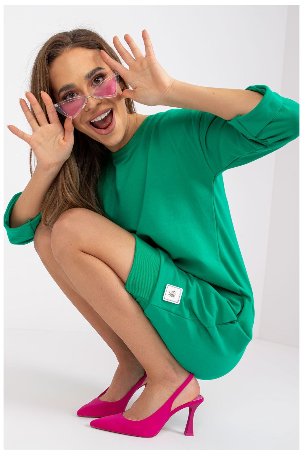Plisované šifonové šaty s výstřihem a dlouhými rukávy. Barva: lahvově zelená. Celé šaty jsou podšité. Značka numoco. Polská výroba.