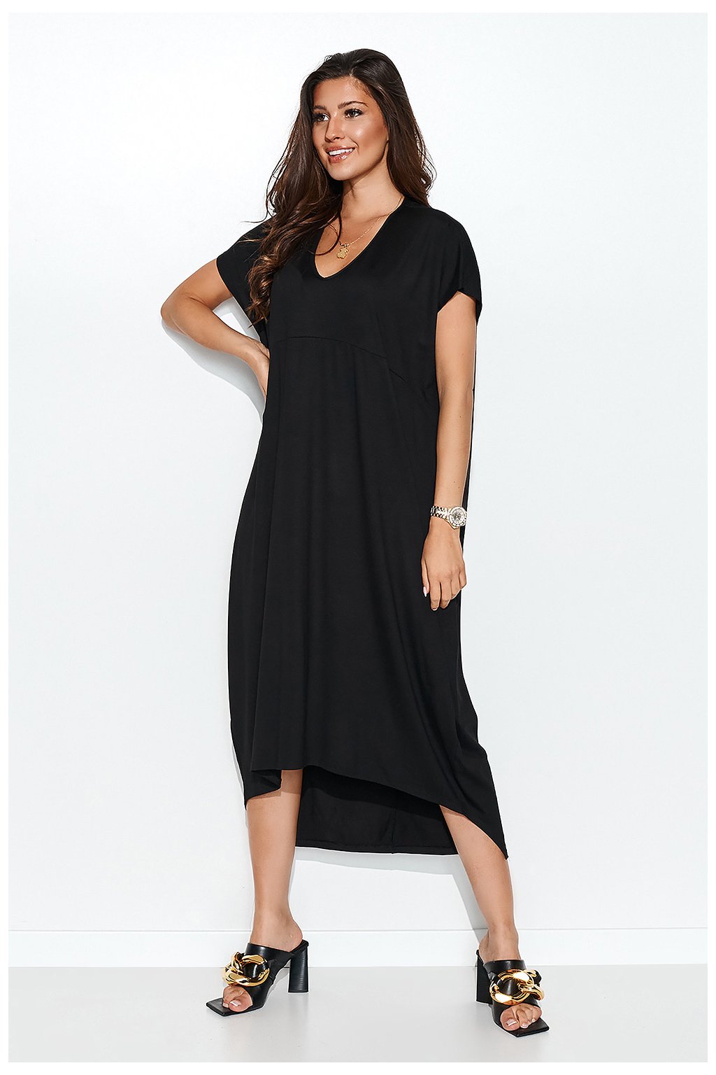 Asymetrické šaty ze vzdušného viskózového úpletu. Vpředu jsou o něco kratší, takže odhalují lýtka, a vzadu delší, sahají téměř k chodidlům. Asymetrie a délka závisí na postavě a výšce. Šaty poskytují velké pohodlí. Je ušita v oversize střihu a navíc má ležérní krátké rukávy. Pod prsy je jemné prošití. Poměrně hluboký, mírně zaoblený výstřih zvýrazňuje poprsí a představuje dokonalé pozadí pro vaše oblíbené šperky. Na zadní straně je našita jemná ozdobná aplikace.Viskóza 95 %