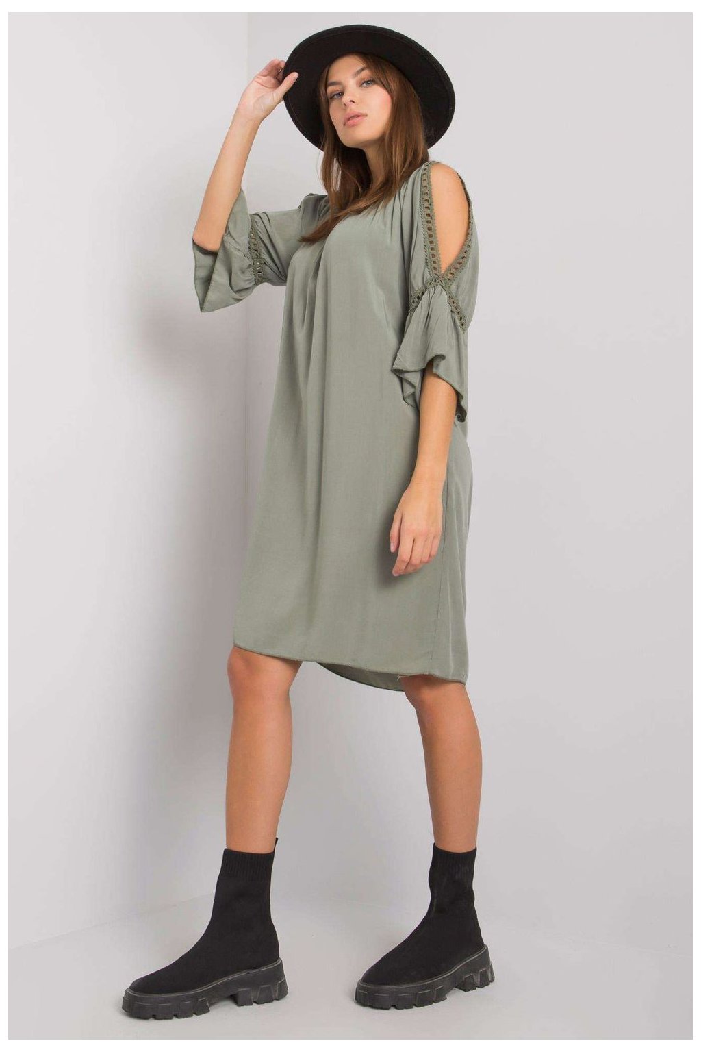 Koktejlové šaty s přiléhavým střihem a 3/4 rukávem. Šaty se zapínají na skrytý zip. Na rameni ozdobný volán. Ideální volba na mnoho příležitostí.