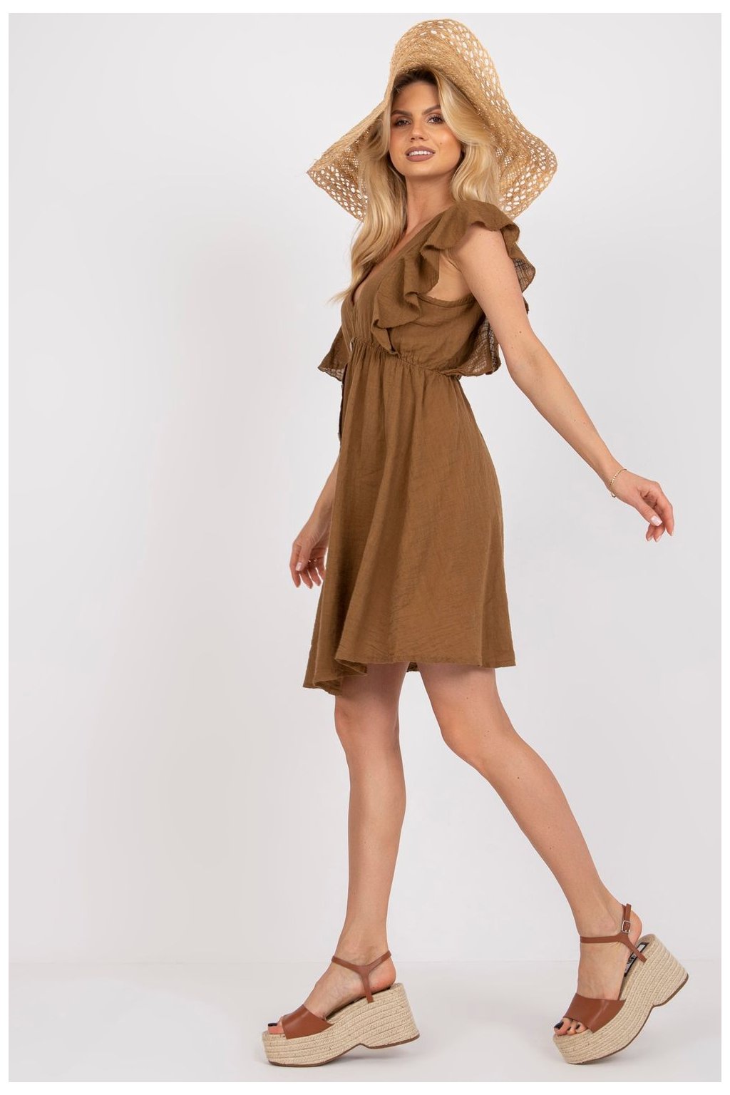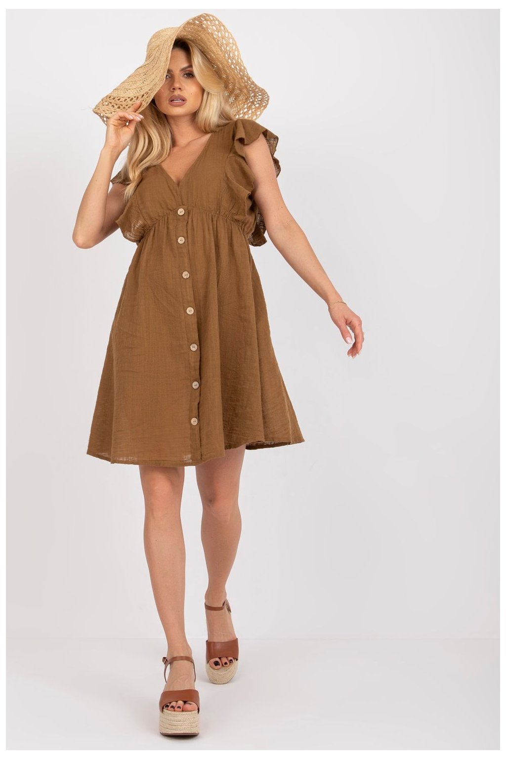 Letní šaty s rozšířeným střihem, zapínání na knoflíky na přední straně. Šaty s krátkými rukávy v podobě volánku, srdíčkový výstřih. Ideální pro každodenní použití a další.| Velikost | Obvod prsou | Obvod v pase |