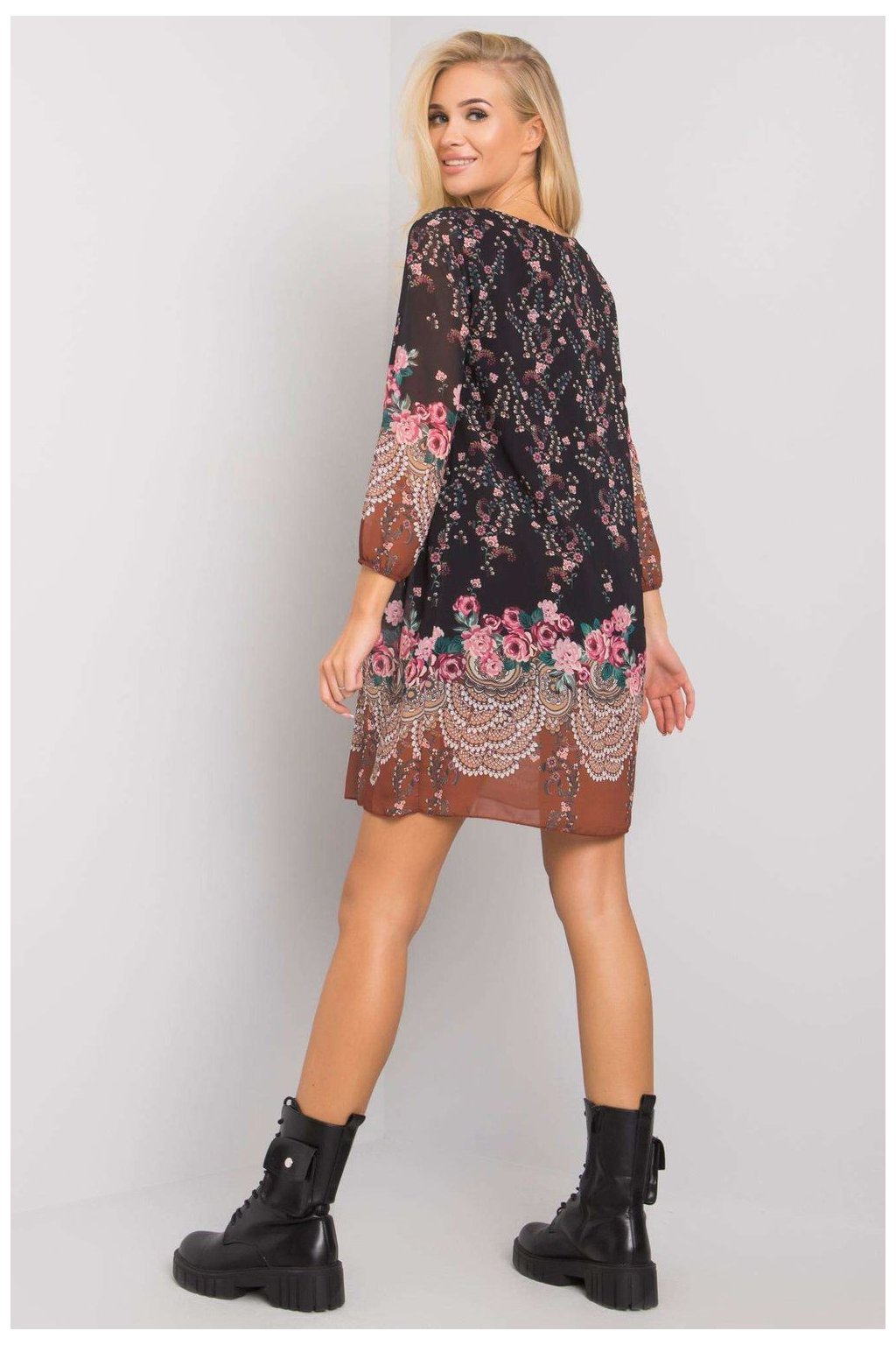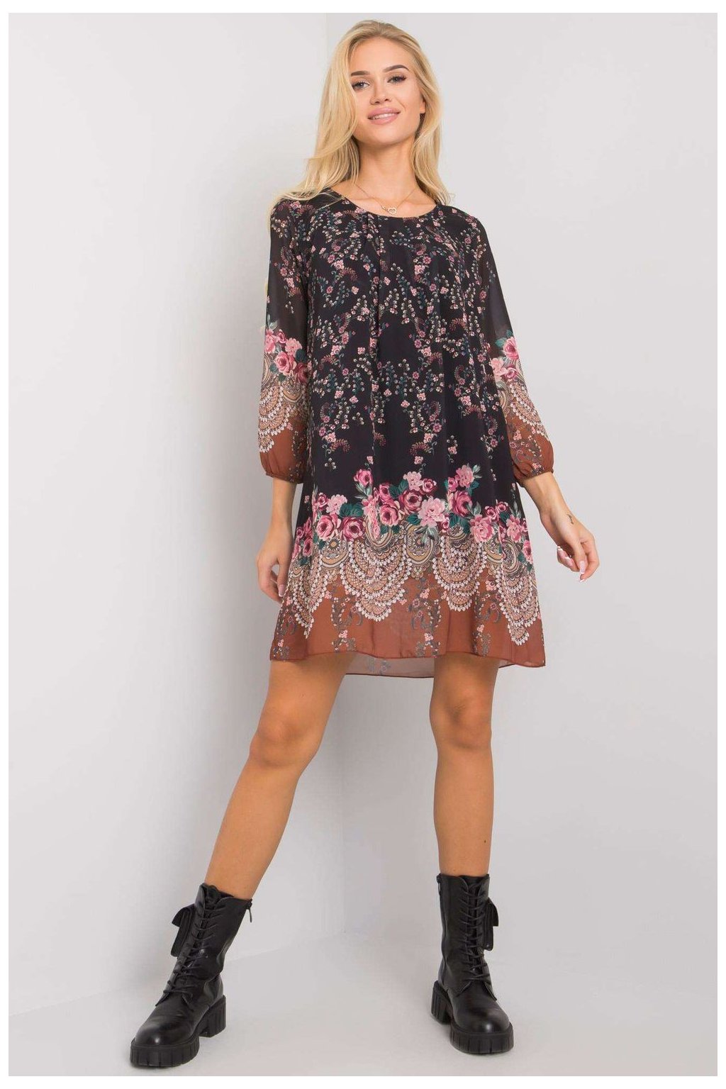 Volné šaty s 3/4 rukávy a kulatým výstřihem. Šaty mají podšívku.| Velikost | Obvod prsou | Obvod v pase |
