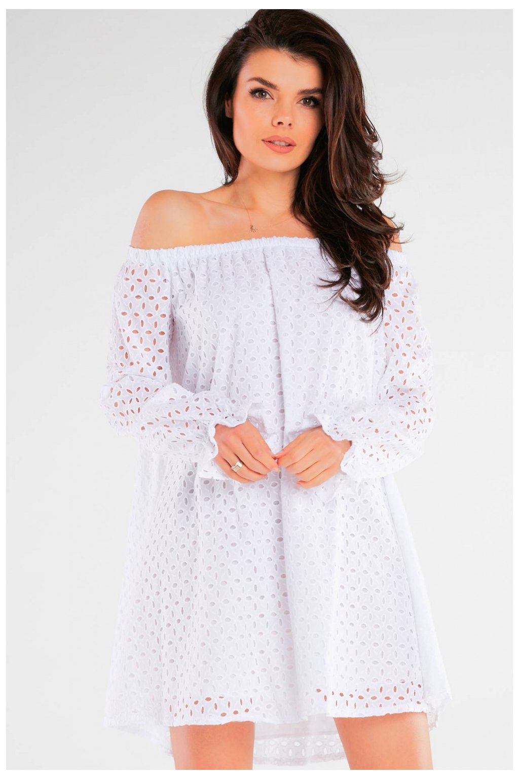 Španělské šaty volného střihu z prolamované bavlny s hladkou podšívkou. Šaty jsou ve výstřihu a na spodní části rukávů nařasené a mají všitou gumičku. Ideální jako styling pro rodinnou oslavu nebo výlet s přáteli. Výrobek je navržen a vyroben v Polsku.| Velikost | Délka | Obvod prsou | Obvod v pase |