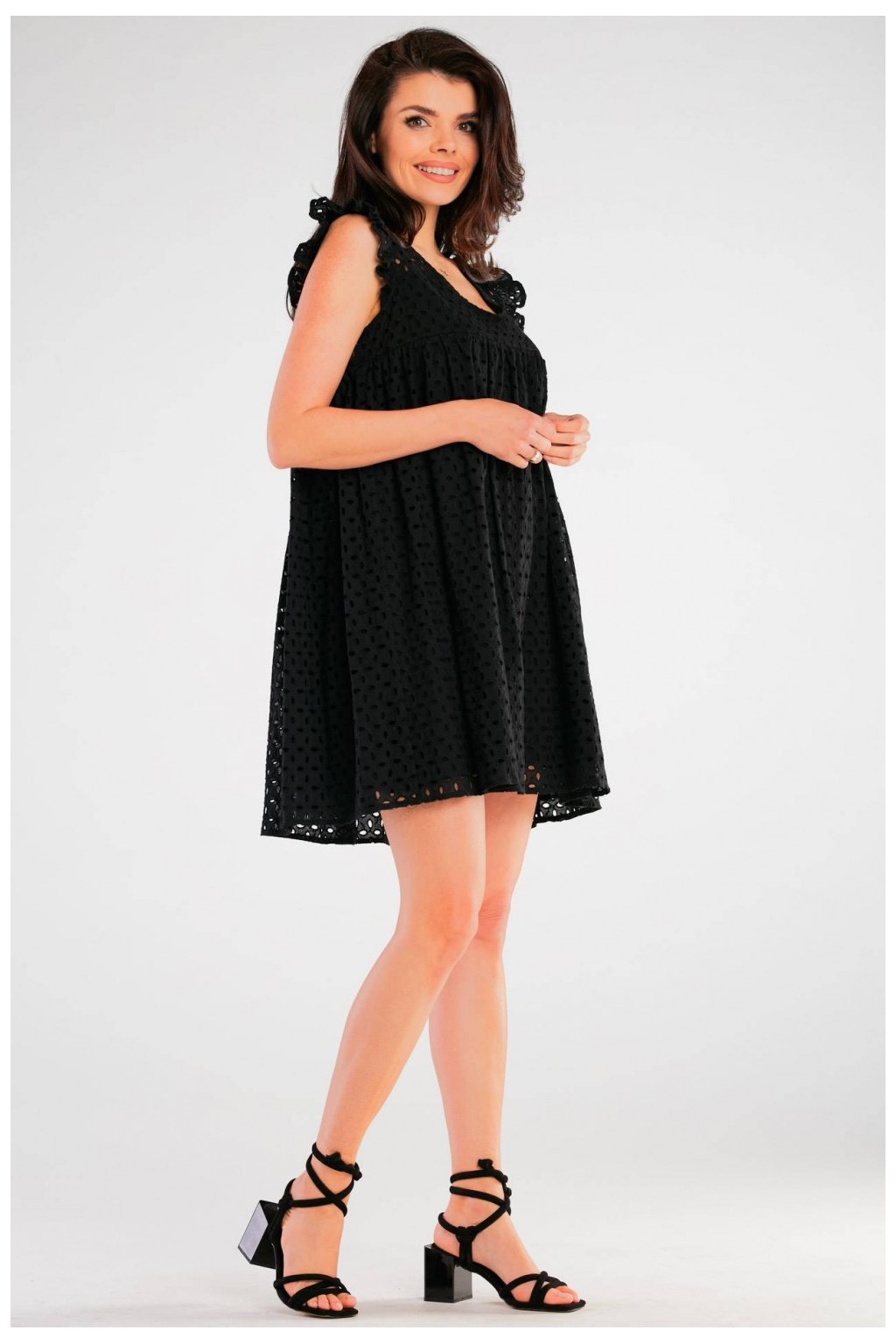 Šaty z prolamované tkaniny s hladkou podšívkou, která zaručuje komfort a pohodlí při používání. Mírně rozšířené od linie prsou, zdobené volánky na ramenou. Skvěle se hodí jako styling na rodinnou oslavu nebo na den s přáteli, záleží jen na výběru doplňků. Výrobek navržený a vyrobený v Polsku.| Velikost | Délka | Obvod prsou |