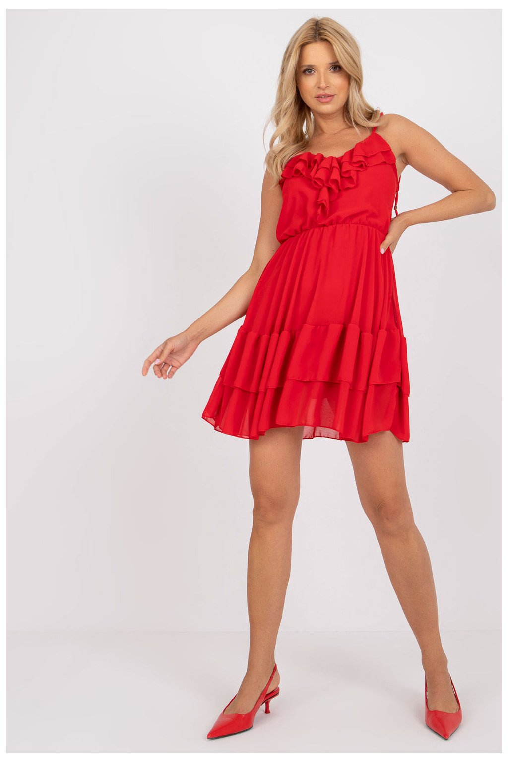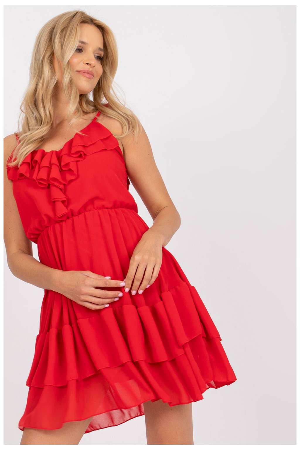 Elegantní šaty s 3/4 rukávy a volánky. Model působí nádherně a expresivně. Jednoduchý, neobvyklý tvar obepíná siluetu a dodává jí romantiku.