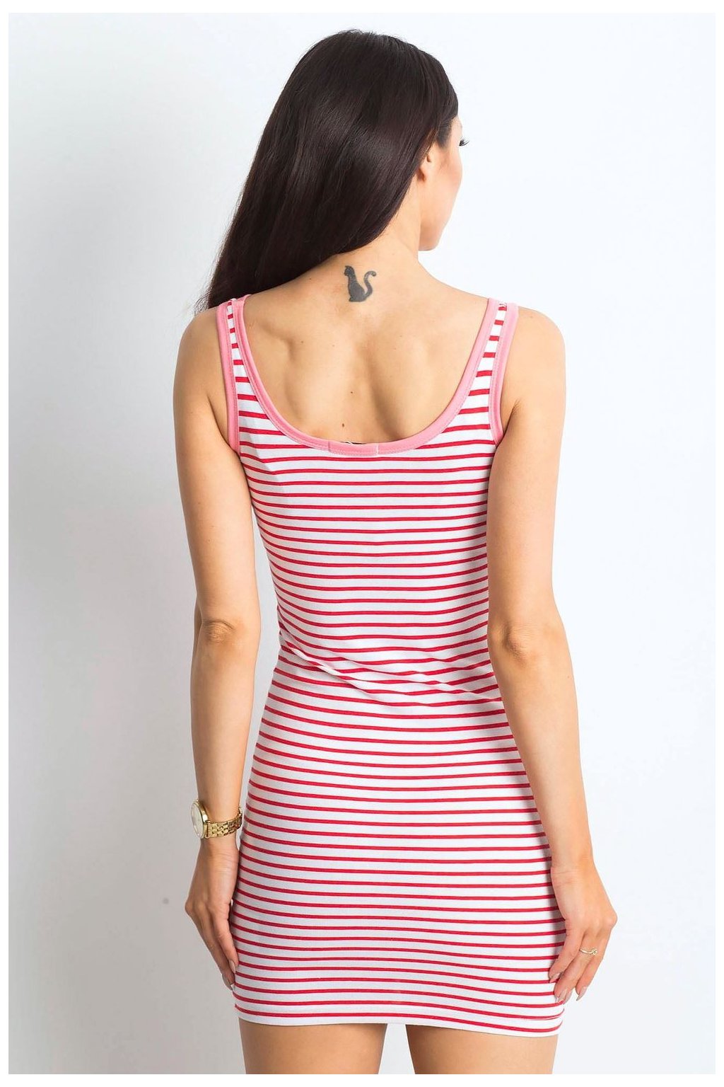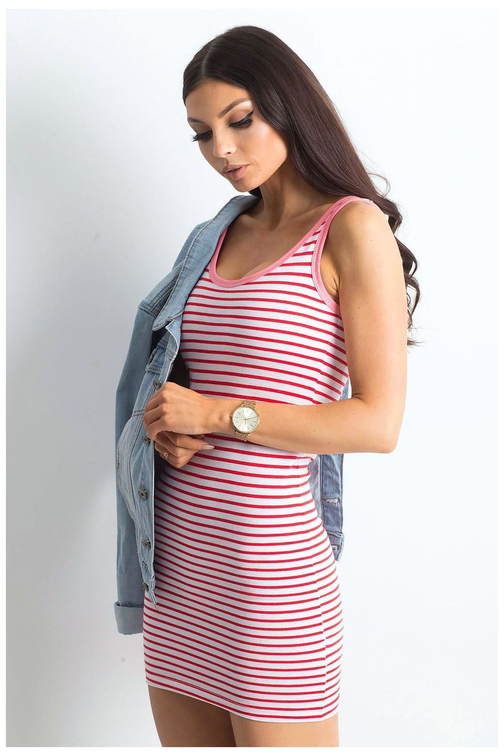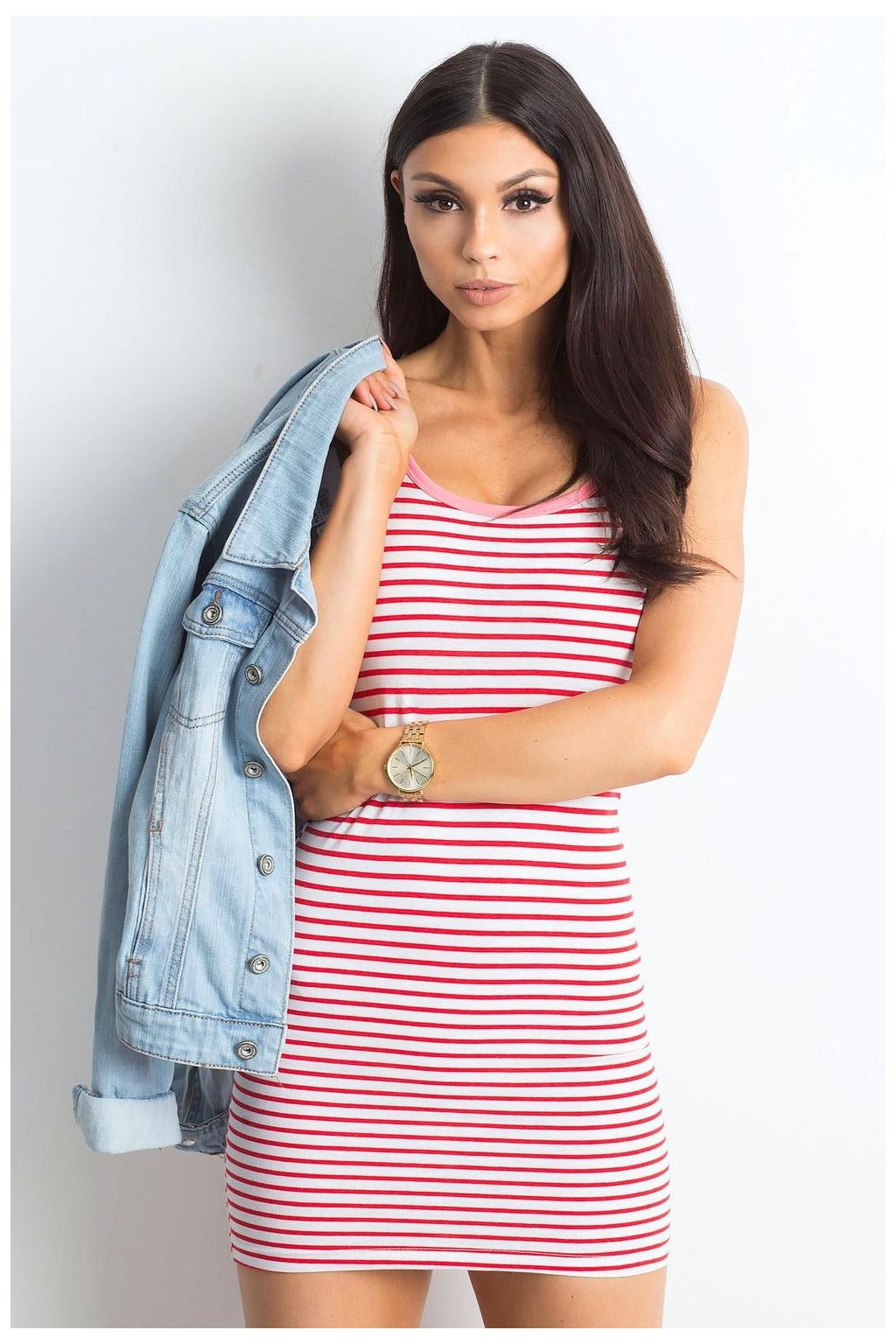 Šaty bez rukávů. S vypasovaným horním dílem a ženským, malým výstřihem. Model je v pase přestřižený a má rozšířenou, do širokých záhybů uspořádanou…