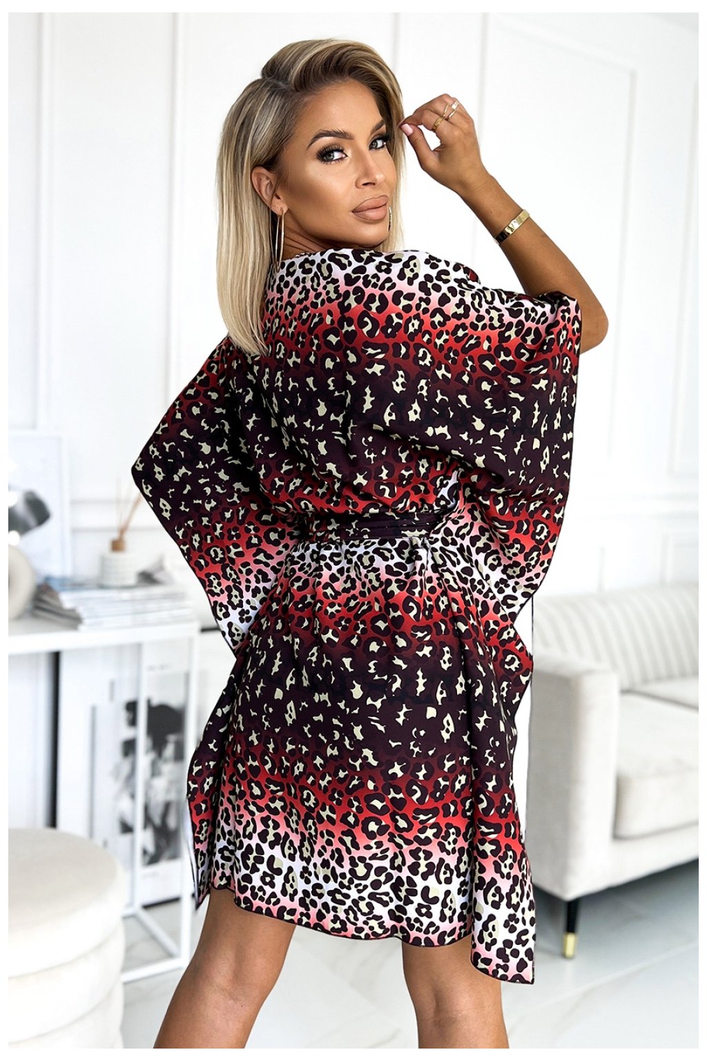 Fialové jarní midi šaty z lehké vzdušné látky, s kimonovými rukávy 3. Výstřih, zavazování na prsou. Plisovaný lem, zapínání na boku na krytý zip.