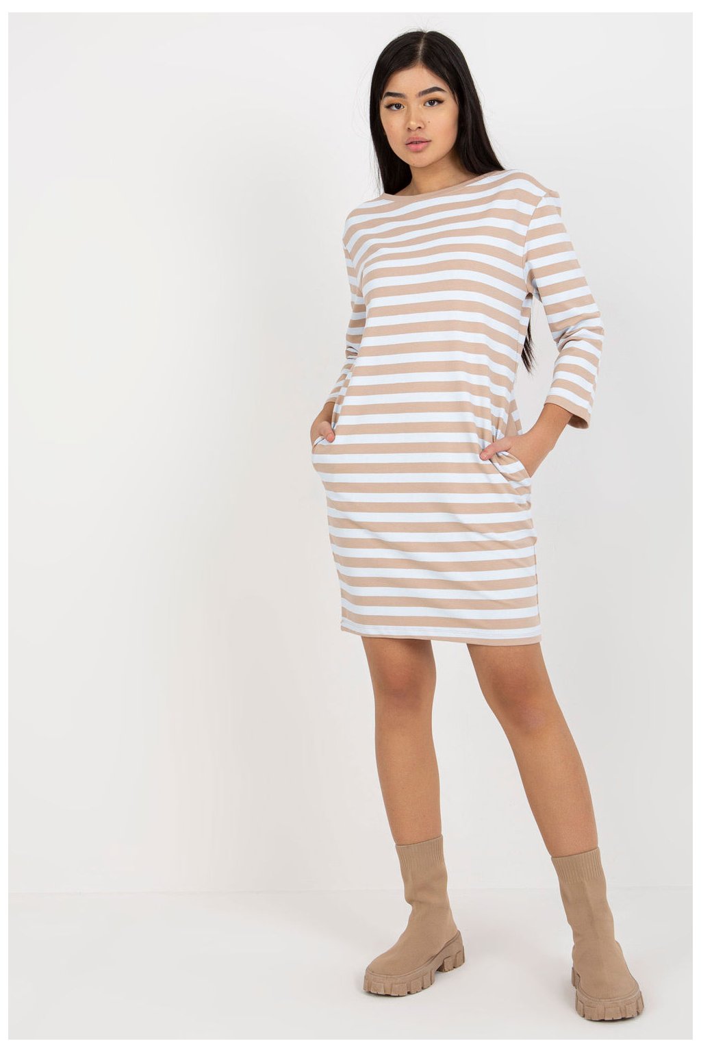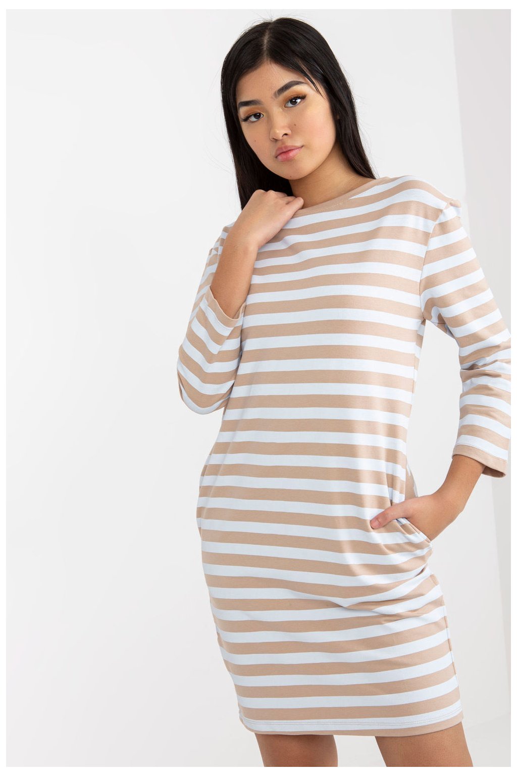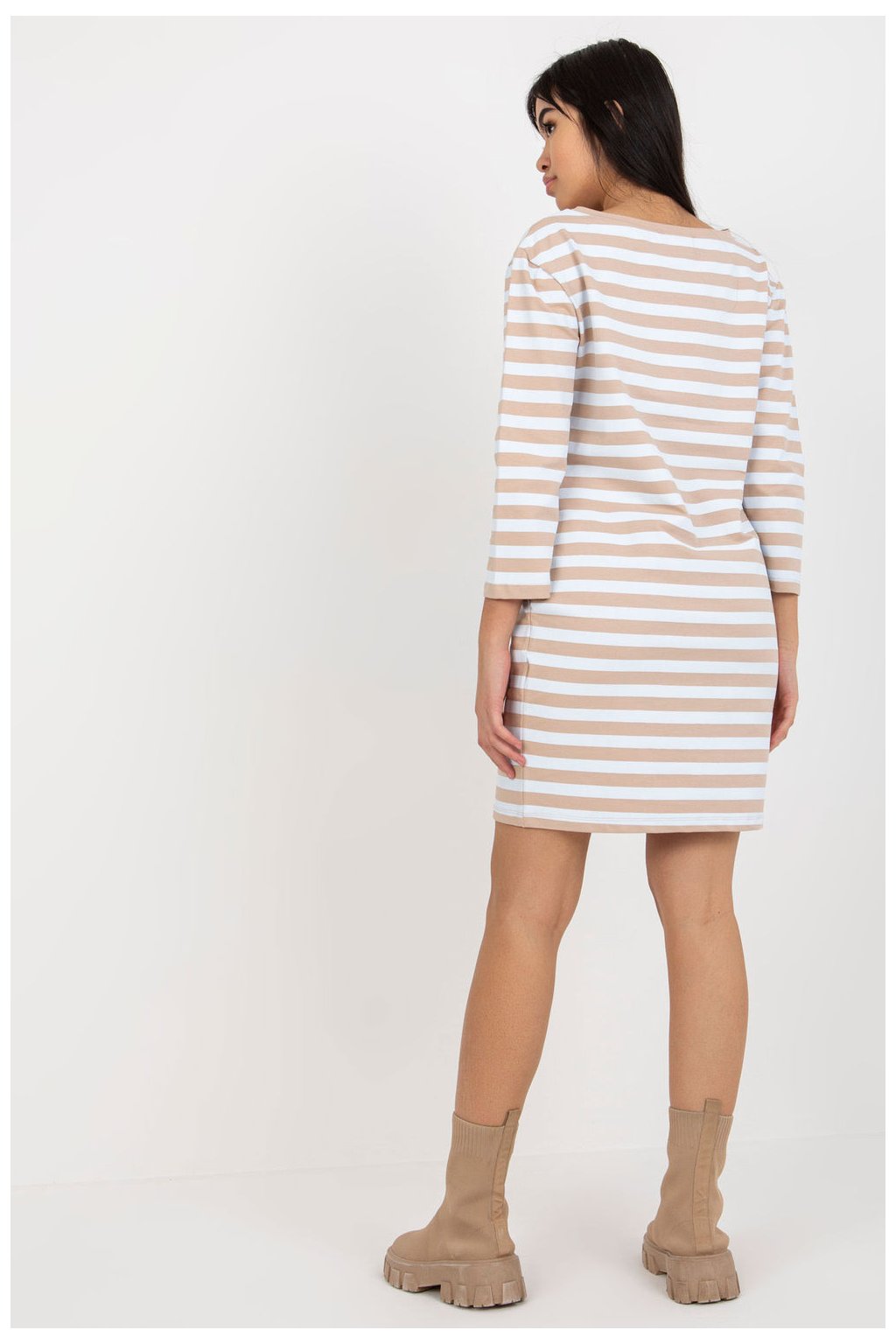 Béžové koktejlové midi šaty s výstřihem do V, 3/4 dlouhými rukávy, záševky na prsou, švem v pase a rozšířenou spodní částí. Zapínání na zádech na…