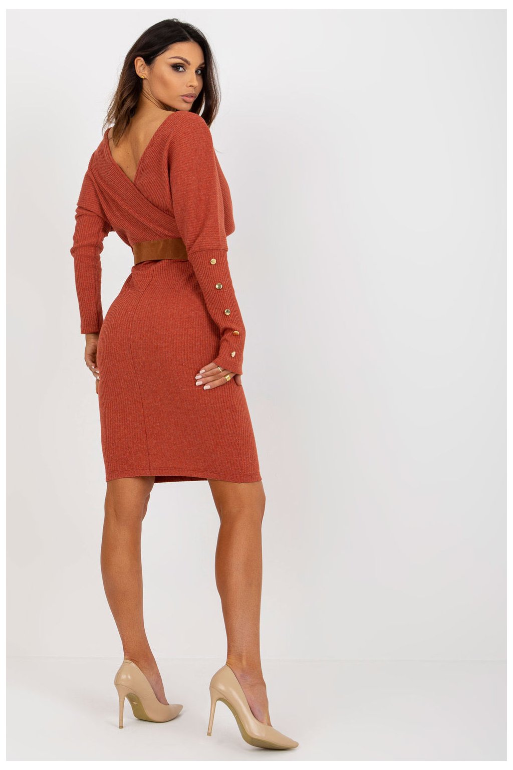 Pletené šaty s obálkovým výstřihem a dlouhými rukávy. Šaty tužkového střihu s páskem na doplnění. Ozdobné knoflíky na rukávech. Návrh ideální pro mnoho příležitostí.Velikost | Obvod prsou | Obvod v pase |