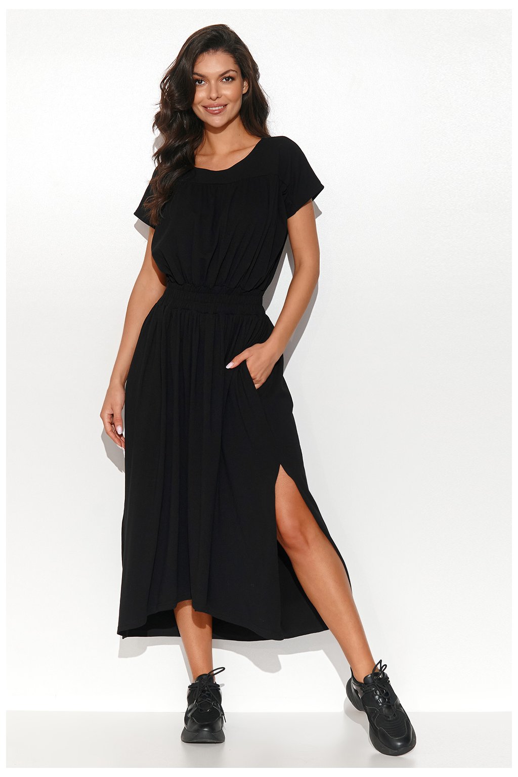 Dlouhé asymetrické šaty ušité z úpletové teplákoviny. Mají kulatý výstřih a v pase jsou opatřeny stahovací gumou. Zadní část šatů je o něco delší než přední, díky čemuž ležérní kreace vypadá na siluetě zajímavě. Téměř po celé délce mají šaty jemné řasení. Na bocích jsou postranní nakládané kapsy. Kulatý výstřih ponechává prostor pro krásný řetízek. Krátké rukávy naopak maskují ramínka spodního prádla. Oblečte si je k oblíbeným botám nebo sandálům a užijte si ležérní, ale elegantní vzhled.Elastan 5 %