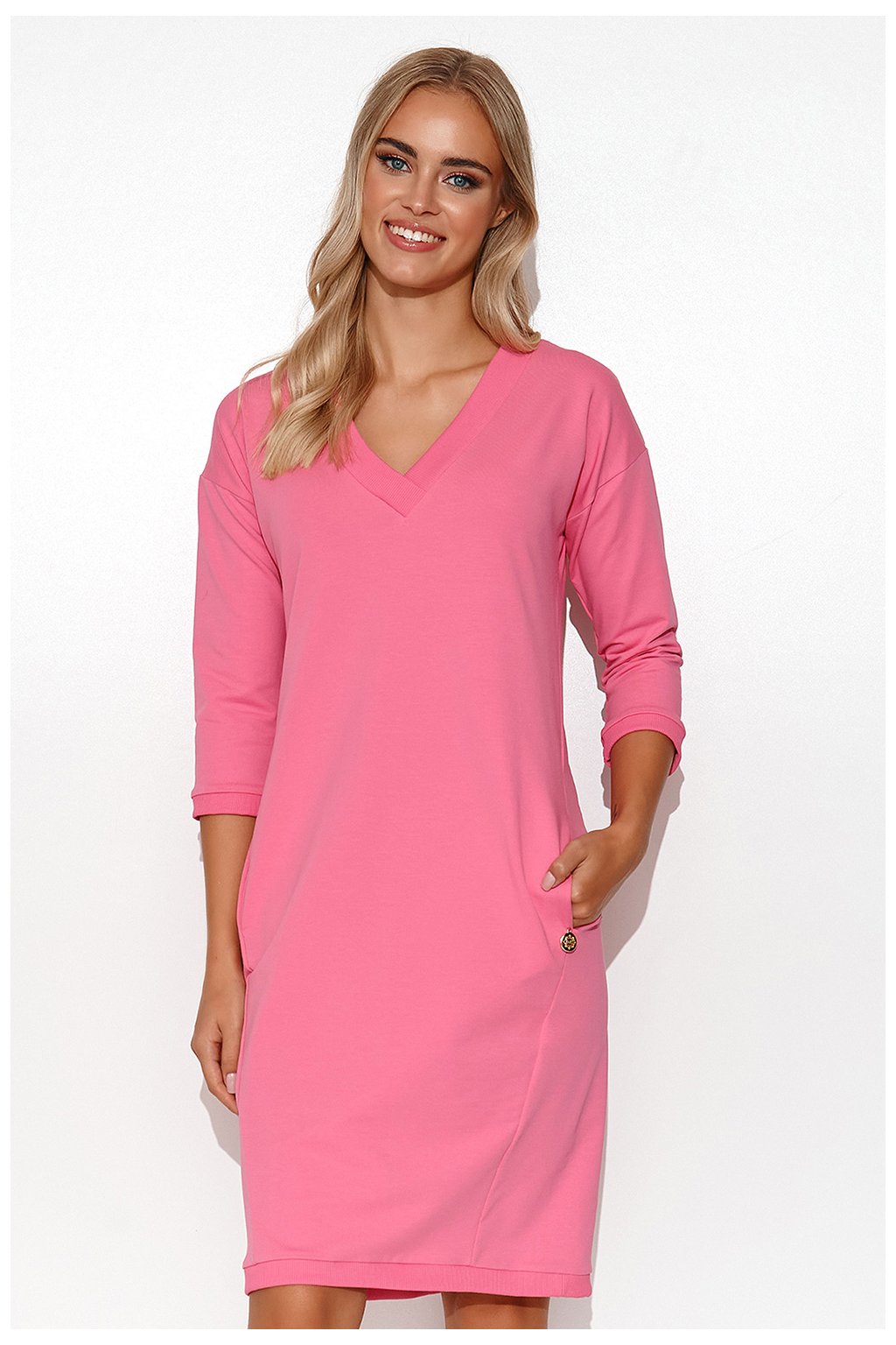 Teplákové šaty jednoduchého, ležérního střihu. Mají hluboký výstřih do V, 3/4 rukávy a praktické boční kapsy. Na jedné z nich je našitý ozdobný zlatý štítek. Šaty mají žebrované lemy, které dodávají sportovní nádech. Zadní díl šatů je hladký, se skrytým švem umístěným uprostřed. Perfektní letní volba, kterou můžete nosit s lehkými teniskami nebo sportovními sandály pro aktivní den.Elastan 5 %