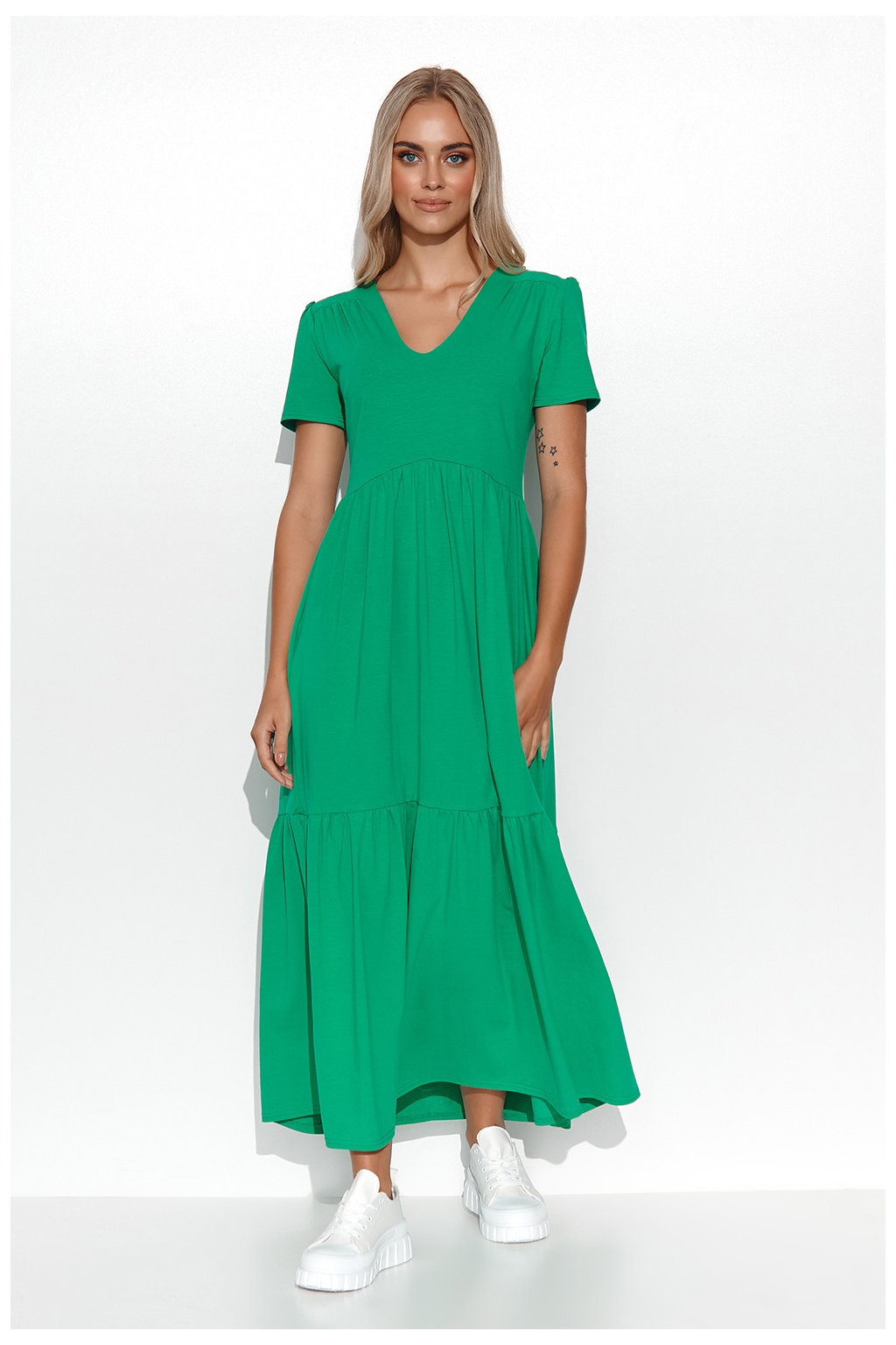 Šaty jsou bezpochyby jedním z nejženštějších kousků ženského šatníku. Není divu, že právě ony dodávají šatům půvab a dívčí šarm. Pletené maxi šaty byly ušity ve velmi klasickém střihu, který z téměř každé ženy udělá přesýpací hodiny. Pohodlný úplet poskytuje pocit volnosti, krátký rukáv zakrývá ramena v jejich nejširších partiích. Výstřih do V prodlužuje krk, zatímco lem v pase zdůrazňuje nejštíhlejší partie ženské postavy a dodává jí lehkost. Lehké volánky, umístěné na několika místech po celé délce šatů, dodají každému oblečení romantický nádech. Maxi šaty v jednobarevném provedení nepotřebují mnoho doplňků, ačkoli jich také mnoho rády přijmou. Sportovní s oblíbenou ledvinkou a teniskami nebo elegantní s lodičkami na podpatku a kabelkou se spojkou.Elastan 5 %