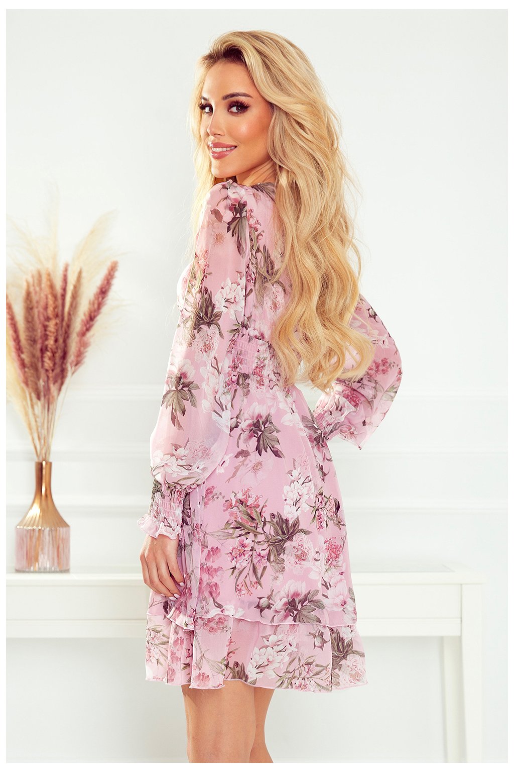 Šifonové šaty s pružným pasem a rukávy. Půvab jim dodává výstřih, který lze libovolně zavázat. Vzorované růžovými květy na pastelovém pozadí. Vyrobeno z šifonu příjemného na dotek s podšívkou (95 % polyester, 5 % elastan). Značka numoco. Polská výroba.Polyester 95 %