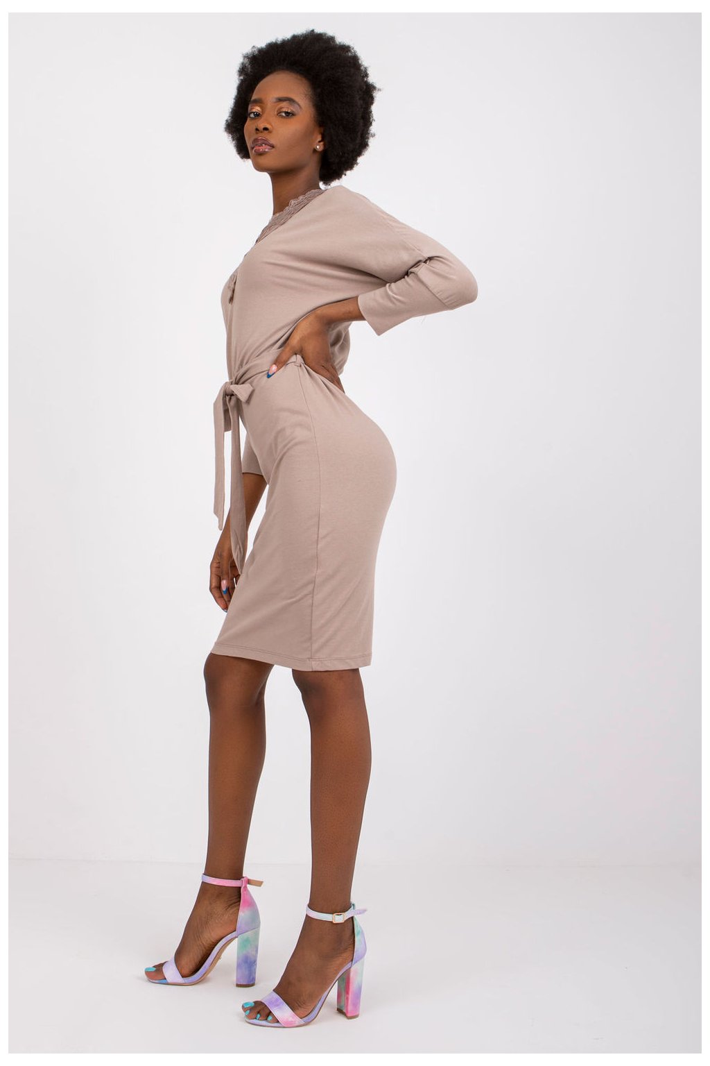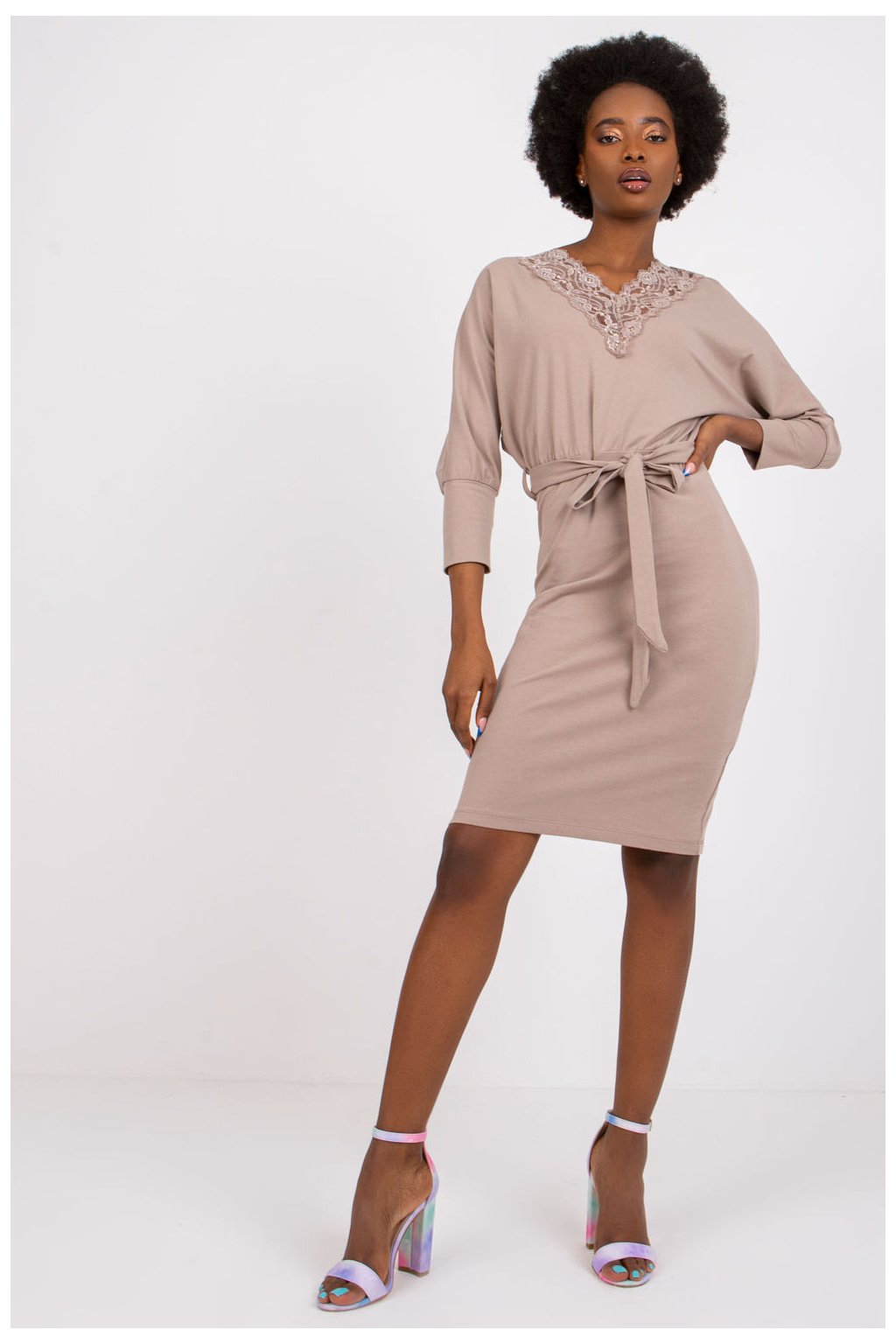 Šaty rovného střihu s 3/4 rukávy a srdíčkovým výstřihem. Výstřih je zdobený ozdobnou krajkou a v pase je pásek na zavázání. Ideální pro mnoho příležitostí.Elastan 10 %
