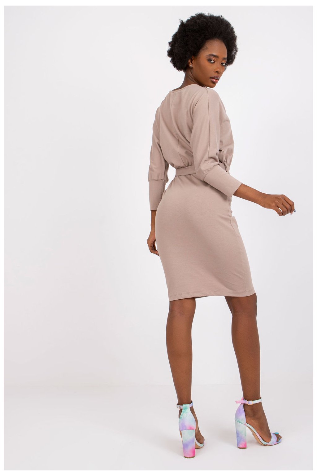 Béžové koktejlové midi šaty s výstřihem do V, 3/4 dlouhými rukávy, záševky na prsou, švem v pase a rozšířenou spodní částí. Zapínání na zádech na…