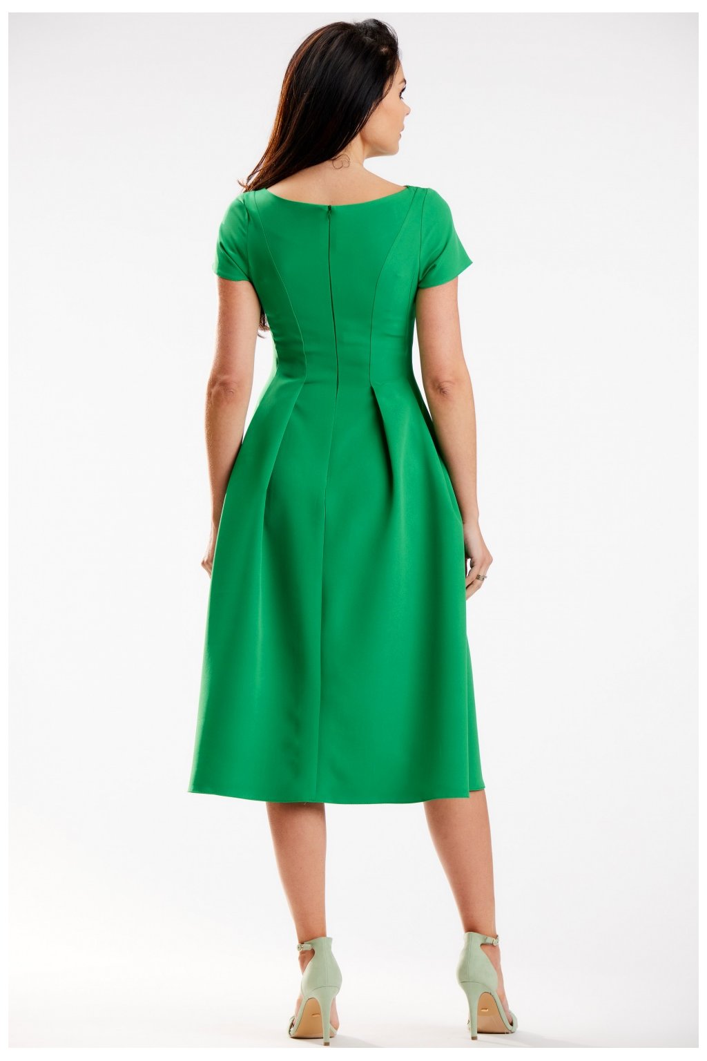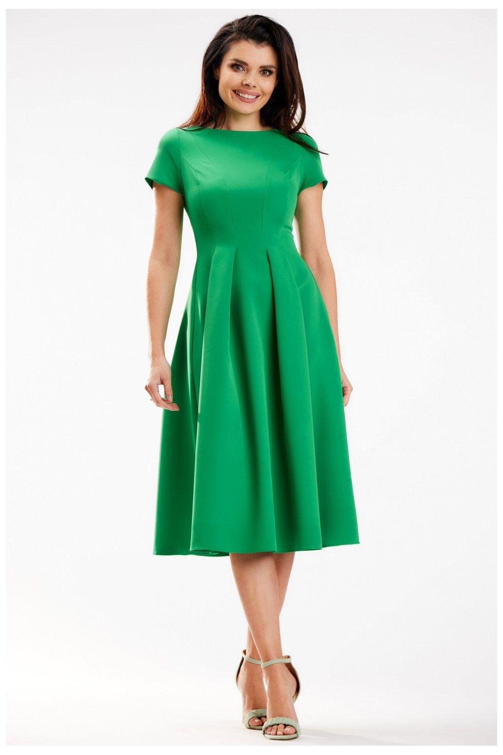 Midi šaty s krátkými rukávy. Lodičkový výstřih. Zapínání na zádech na krytý zip. Šaty krásně tvarují siluetu a zdůrazňují přednosti a zároveň maskují nedostatky. Navrženo a ušito v Polsku.Polyester 95 %