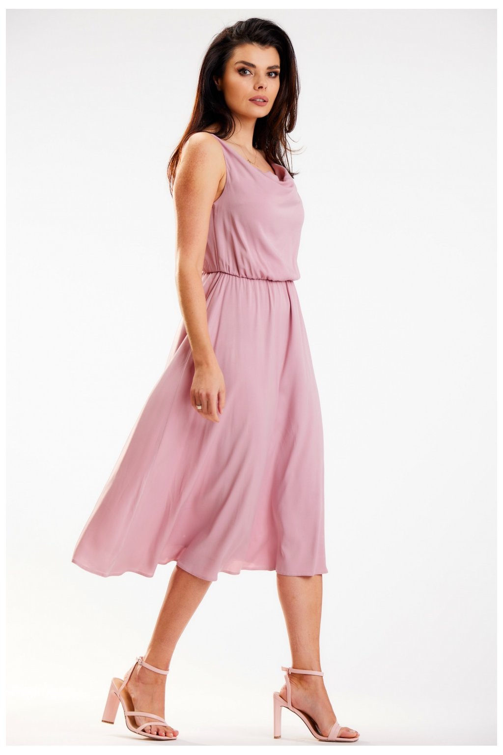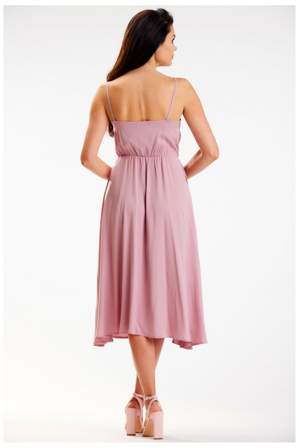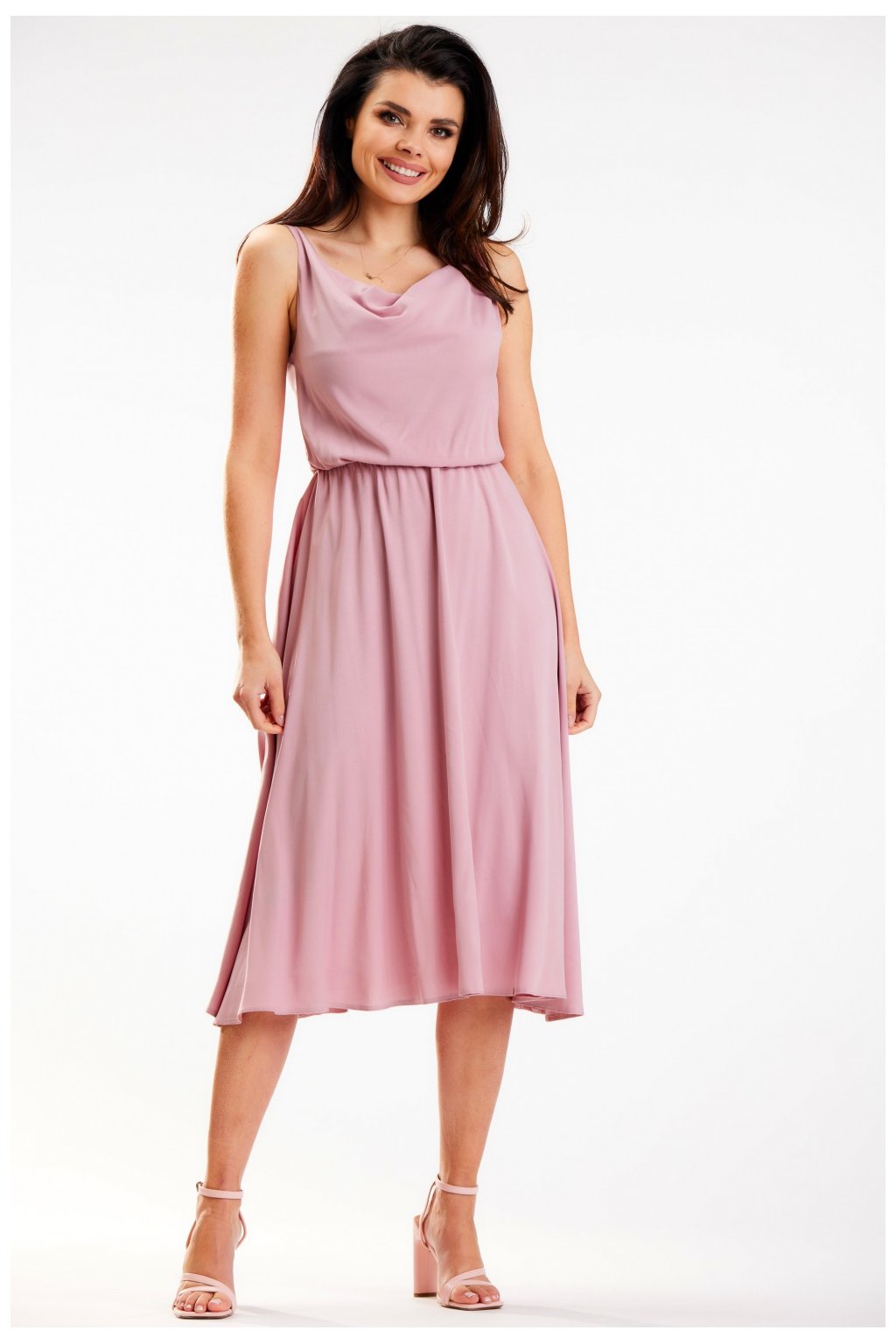 Elegantní midi šaty na tenká ramínka. Výstřih šatů je nařasený a splývavý. V pase nařasený elastický pásek, který se přizpůsobí postavě. Navrženo a ušito v Polsku.Viskóza 97 %