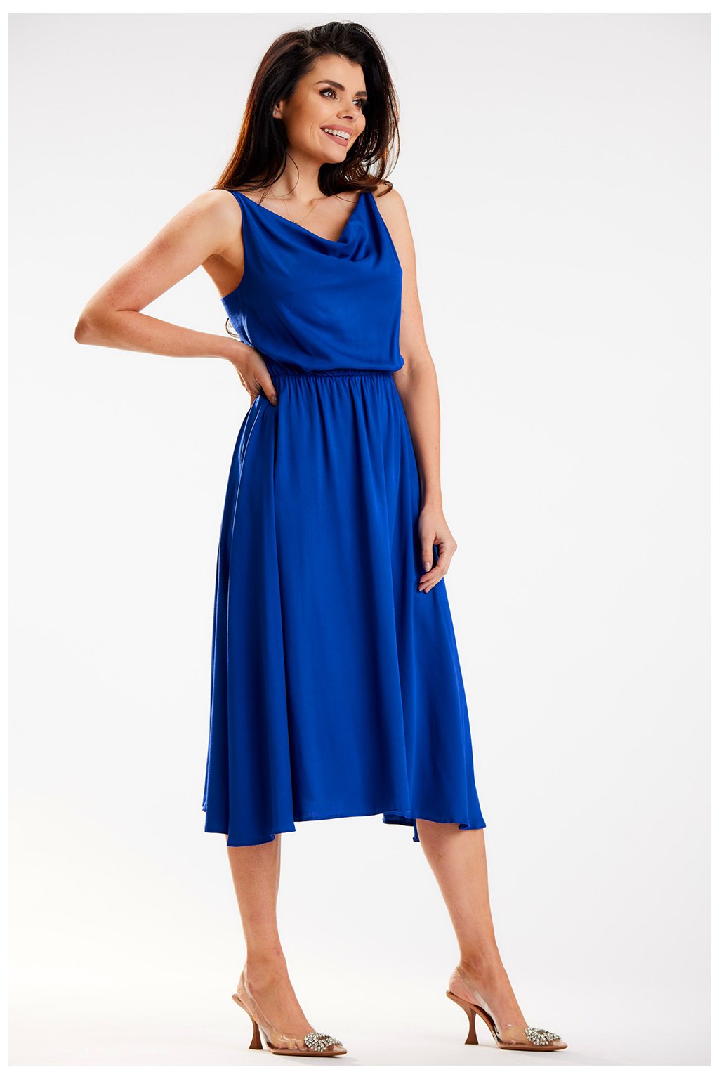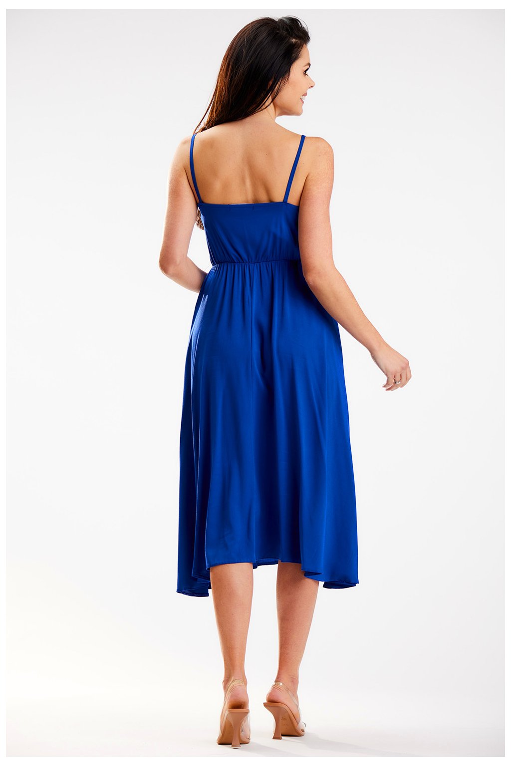 Elegantní midi šaty s tenkými ramínky. Sukně má krejčovské záhyby a je tekutá. V pase jsou šaty marscovány pryží pro přizpůsobení postavy. Navrženo a ušito v Polsku.Viskóza 97 %
