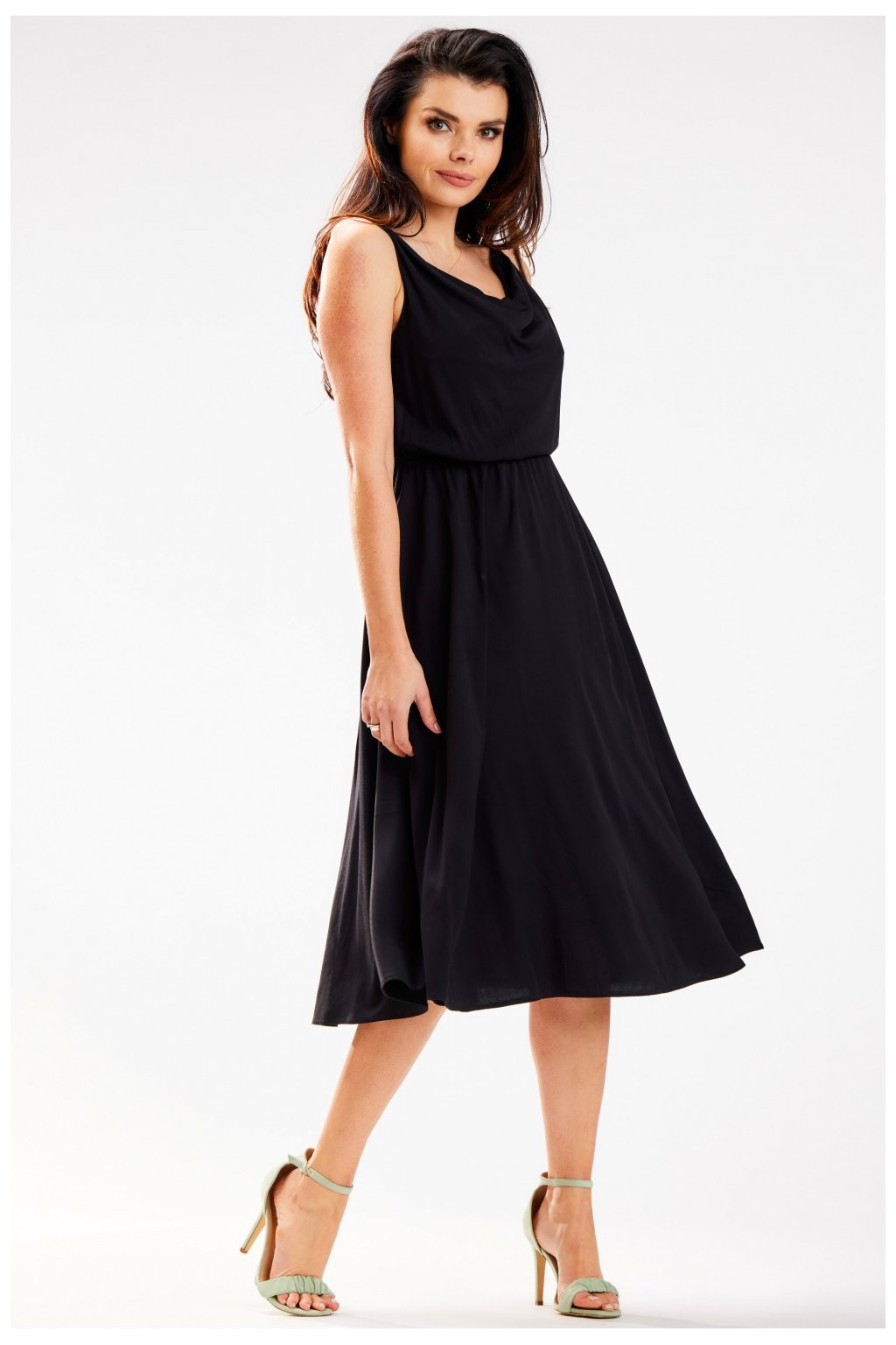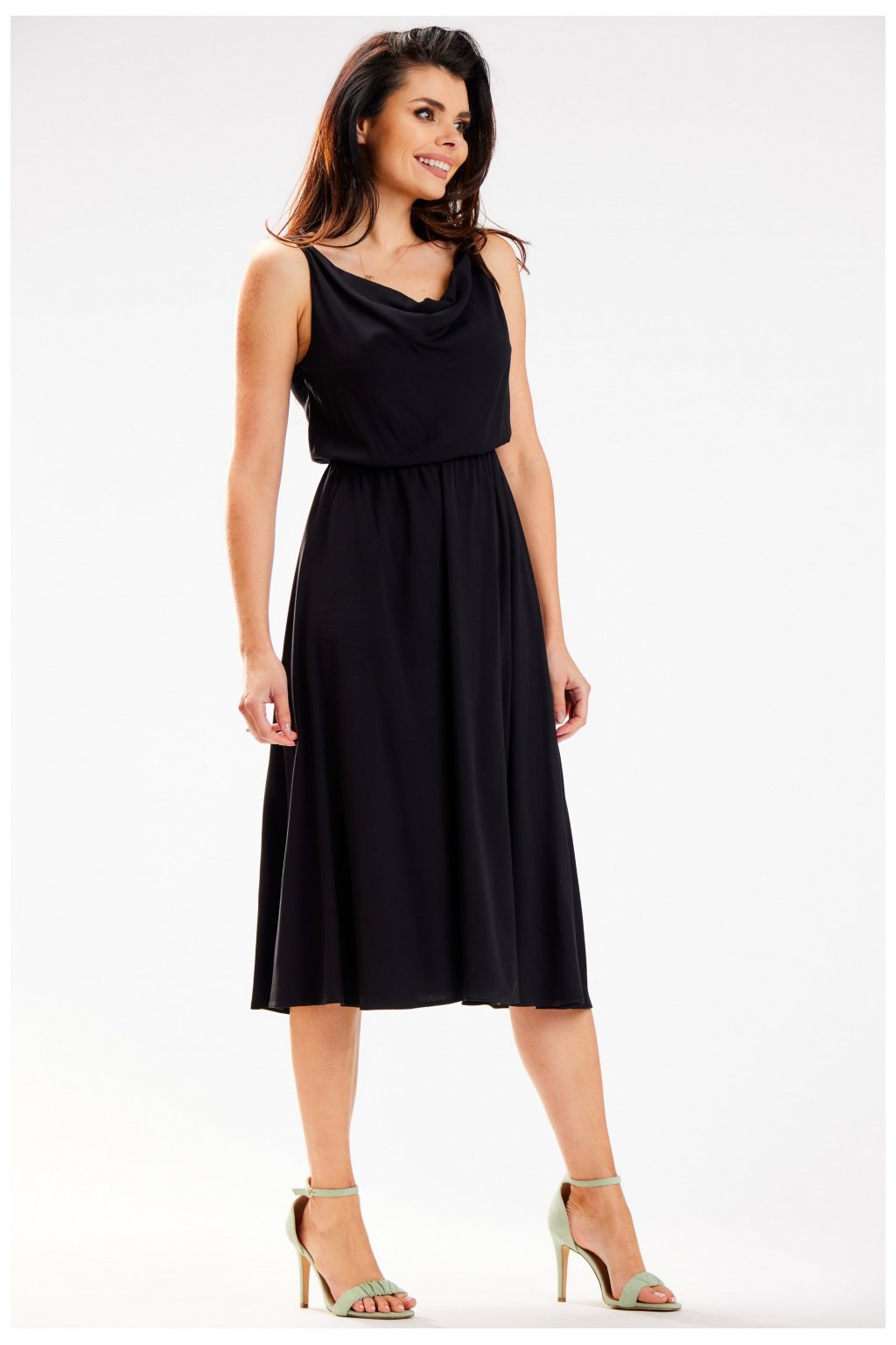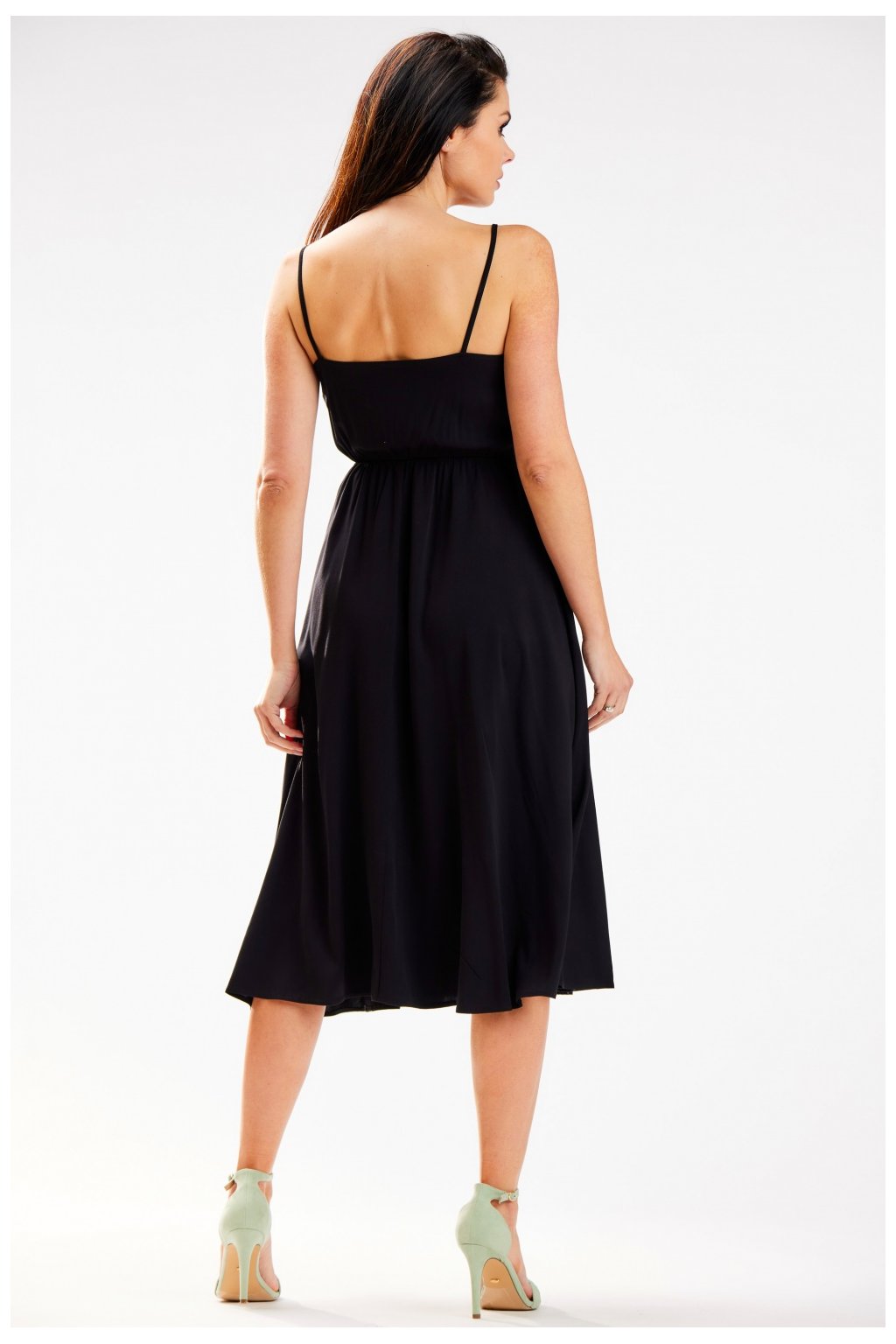 Elegantní midi šaty na tenká ramínka. Výstřih šatů je nařasený a splývavý. V pase nařasený elastický pásek, který se přizpůsobí postavě. Navrženo a ušito v Polsku.Viskóza 97 %