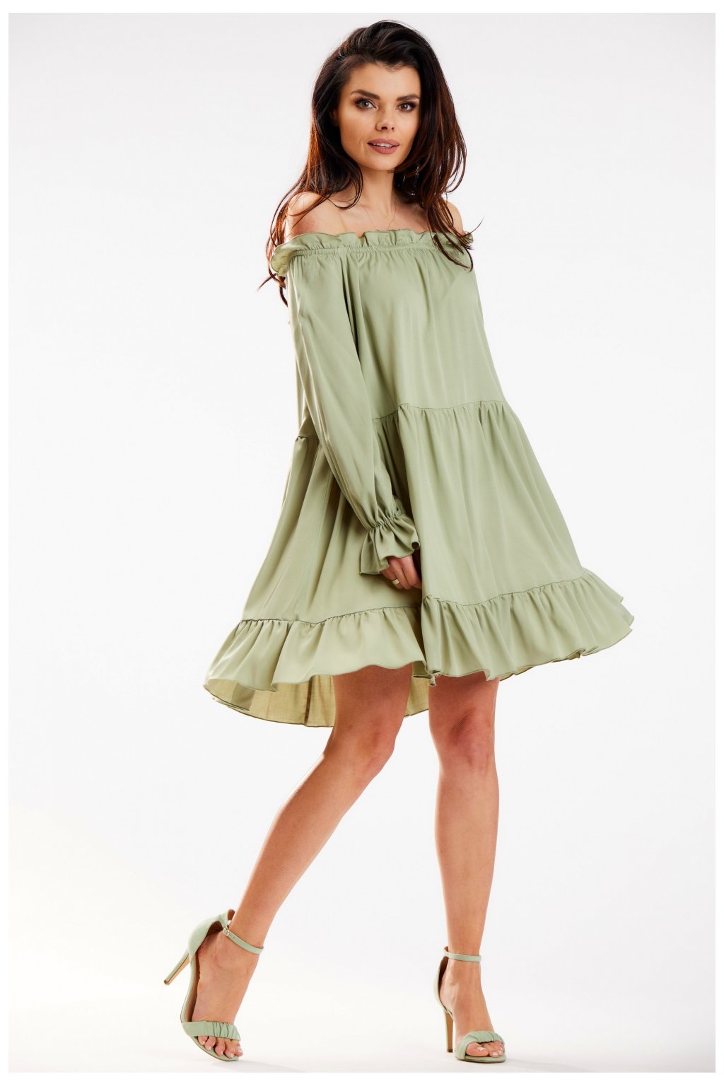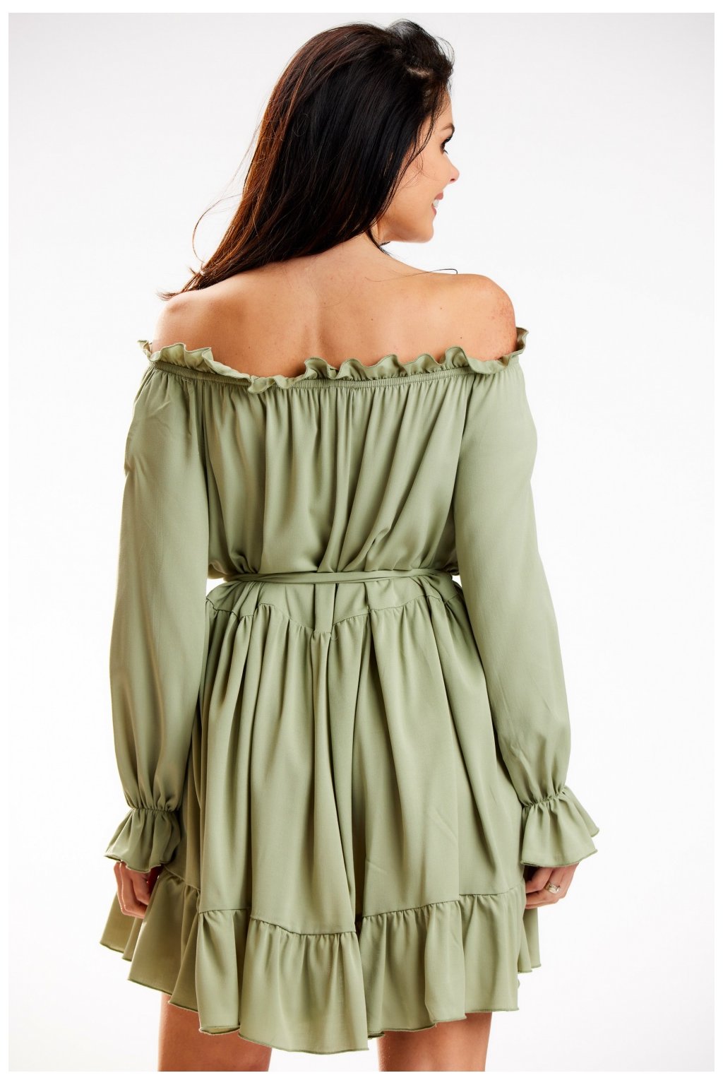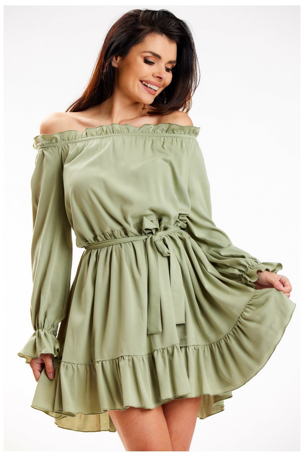 Španělské šaty s dlouhým rukávem zakončeným volánem. Můžete je nosit na dva způsoby, buď jako lehké dívčí šaty ve tvaru písmene A, nebo svázané páskem vyrobeným z toho samého materiálu jako šaty. Skvěle se hodí na podpatky na různé příležitosti i na tenisky na každý den. Navrženo a ušito v Polsku.Viskóza 97 %